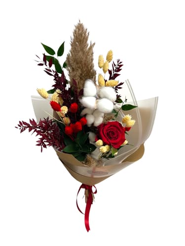 A rózsát természetes tónusú pampafű, puha gyapot, aranyló és bordó szárított virágok, valamint zöld levelek egészítik ki. A meleg bézs–bordó–vörös színvilág kifinomult, mégis karakteres megjelenést ad a csokornak.