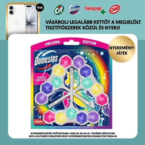 The Domestos Power5 Magic Unicorn WC freshener block is your go-to for a sparkling clean and fresh toilet. This EU-made 3-pack, with 3x50g blocks, effectively removes dirt, fights limescale, and provides long-lasting fragrance. Enjoy its strong foaming action, ensuring hygiene and brilliant cleanliness with every flush. Keep your bathroom smelling magical and looking spotless!