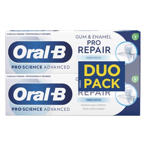 Oral-B Pro-Science Advanced Gum & Enamel Pro-Repair reduces gum irritation and helps restore tooth enamel. It neutralises harmful bacteria from plaque, thus reducing gum irritation; remineralises tooth enamel and protects teeth against acid erosion. Toothpaste recommended for everyday use, for sensitive teeth.