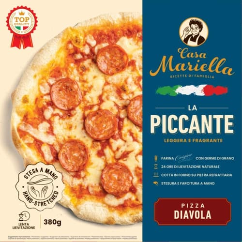Taste the Casa Mariella Pizza Diavola "La Piccante" (The Spicy) pizza, and enjoy the fiery flavour of Southern Italian tastes with the fastest Italian convenience! If you're looking for a bold, spicy twist on the classic, creamy Margherita base, then this frozen pizza is the perfect choice for fiery dinners.