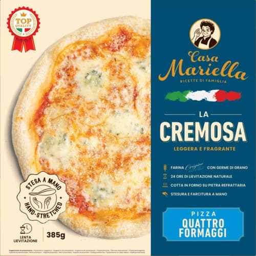 Taste the Casa Mariella Four Cheese "La Cremosa" (The Creamy) pizza and enjoy the rich, Italian medley of cheesy flavours! If you crave the creaminess of four types of cheese on a thin, crispy crust, melting in your mouth with every bite, then this frozen pizza is the perfect choice for quick and indulgent Italian dinners.
