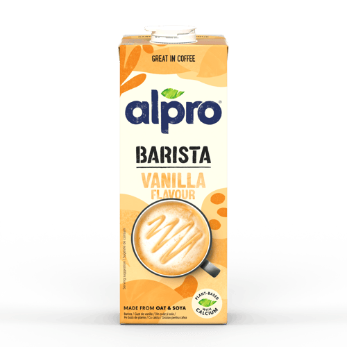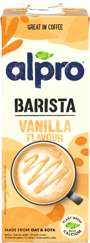 Belgium,ALPRO Barista Italian Style vanilla drink in a 1-liter pack, for coffee beverages and at-home barista use. Its vanilla flavor pairs well with espresso, cappuccino, and iced coffee.