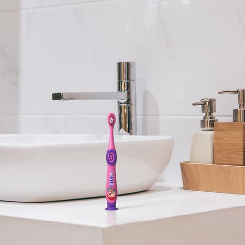 The children's toothbrush is designed with extra soft bristles and a small brush head, to effectively and gently clean even the smallest teeth.