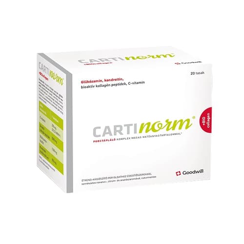 As we age or due to increased stress, the cartilage in our joints wears out and loses its water content and flexibility. Cartinorm®+BIOcollagen dietary supplement powder nourishes the cartilage with the natural components of cartilage tissue (glucosamine, chondroitin sulfate), as well as bioactive collagen peptides and vitamin C. Collagen is an important structural protein in the connective tissue of joints, cartilage, bones, muscles, and ligaments. Bioactive collagen peptides are produced from natural collagen through a special enzymatic hydrolysis process. This ensures better absorption and bioavailability of the bioactive collagen peptides. *Vitamin C contributes to normal collagen formation, and through this, to the normal condition and function of cartilage, as well as the maintenance of normal bones. With natural orange, lemon, and pineapple flavors. Directions for use Recommended dosage: 1 sachet per day. Dissolve the contents of the sachet in half a glass of water. Continuous use of the product is recommended, for at least 3 months. Due to its solution form, it can also be used in case of difficulty swallowing. Ingredients: bioactive collagen peptides, glucosamine sulfate sodium chloride (crustacean/shellfish origin), sweeteners (sorbitol, sucralose), chondroitin sulfate sodium, acidity regulator (citric acid), L-ascorbic acid, flavor enhancers (orange, lemon, and pineapple flavors), anti-caking agent (silicon dioxide). Warning: Dietary supplements do not replace a balanced, varied, mixed diet and a healthy lifestyle! Do not exceed the recommended daily dose! Due to its sorbitol content, excessive consumption may have a laxative effect! Keep the product out of reach of children! Do not take the product if you are allergic to shellfish and/or crustaceans! Consumption is not recommended for pregnant and breastfeeding women, or for children. Storage: Store at room temperature, protected from sunlight and moisture, in the original packaging. Distributed by: Goodwill Pharma Kft., 6724 Szeged, Cserzy Mihály utca 32.