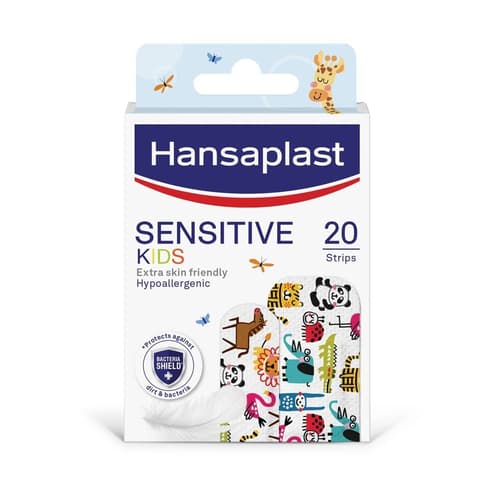 Hansaplast Sensitive Kids wound dressings are hypoallergenic and perfect for your little ones' sensitive skin. This pack of 20 pieces is designed to cover minor injuries, cuts, and abrasions, providing reliable protection. Thanks to its special Bacteria Shield technology, it effectively shields the wound from bacteria and dirt, ensuring quick and safe healing for active kids.