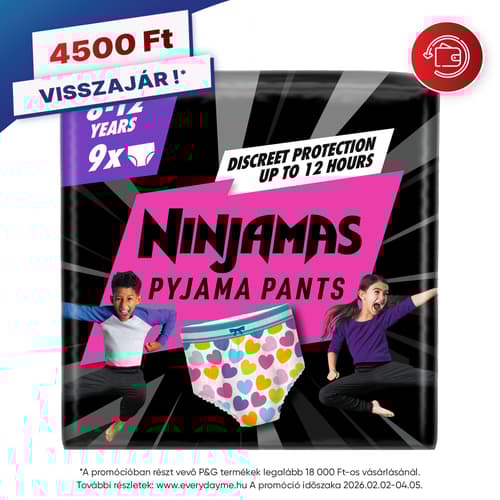 Introducing Ninjamas Pyjama Pants Bugyipelenka. Take on the night and wake up confident with overnight leakage protection. Ninjamas Instant Absorbency Technology quickly absorbs wetness for protection that's like nothing you've felt before. The 360° FormFit Waistband adapts to your child's waist for a discreet and comfortable fit that feels just like underwear, so they can wake up happy and refreshed every day.