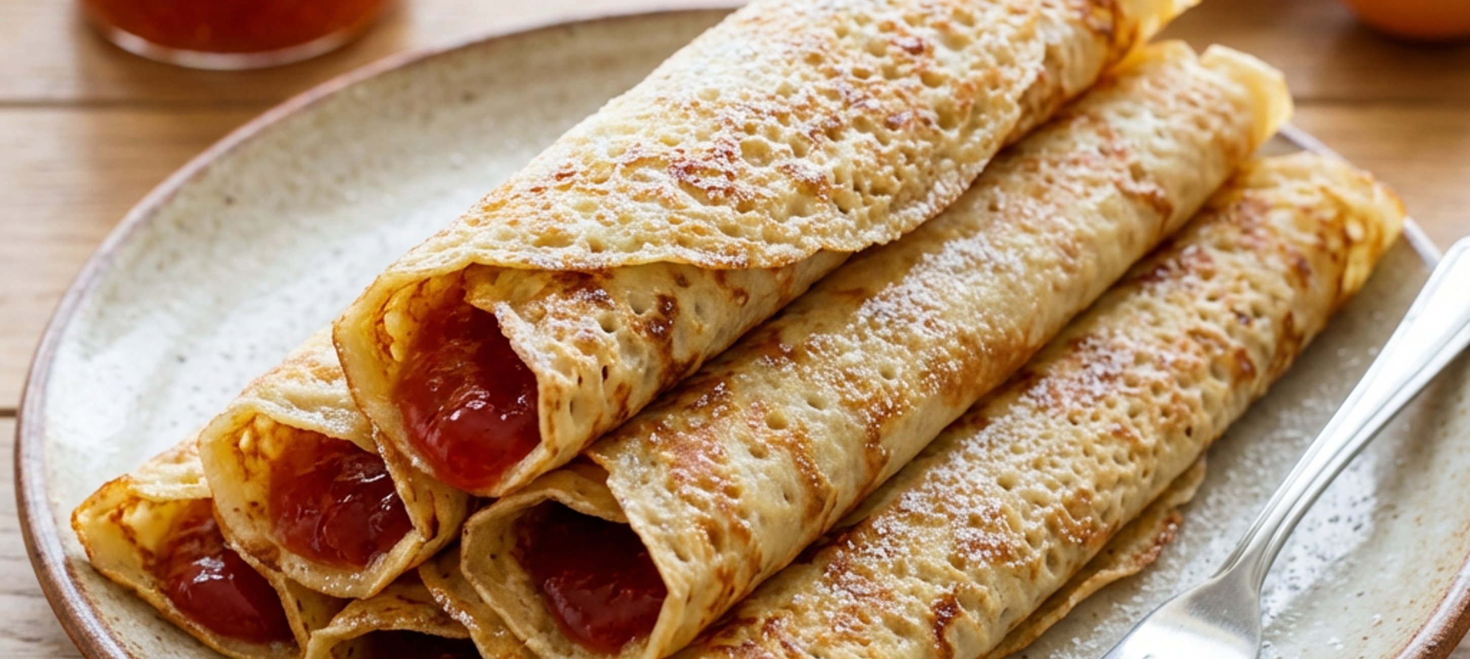 - 3Place the finished pancakes on a plate, then spread them with jam and roll them up. Finally, sprinkle with powdered sugar!