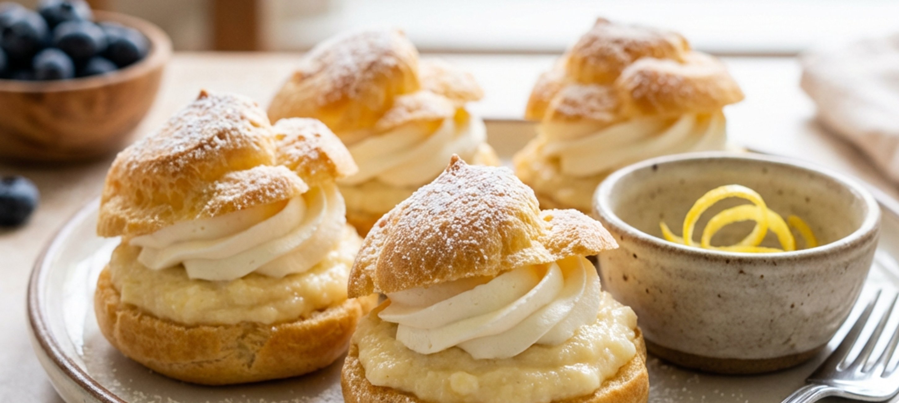 - 6Cut off the tops of the baked and cooled profiteroles, fill them with the cream, replace their 'hats', and sprinkle with powdered sugar or drizzle with melted chocolate to taste.