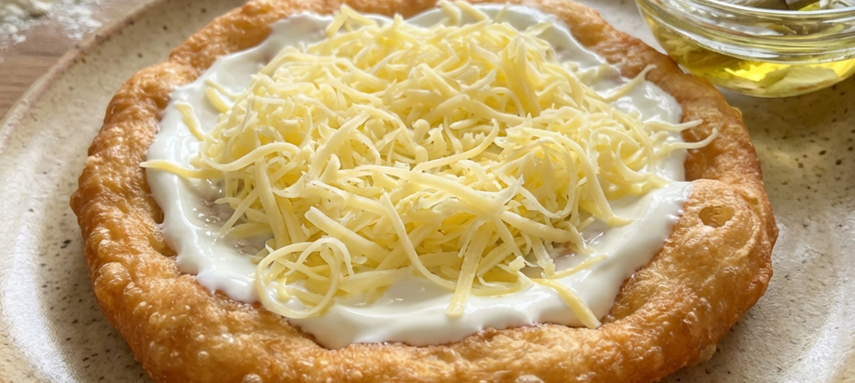 - 4Once the dough has risen, form loaves of desired size with oiled hands, then stretch the edges to shape the lángos and fry both sides in hot oil until golden brown.