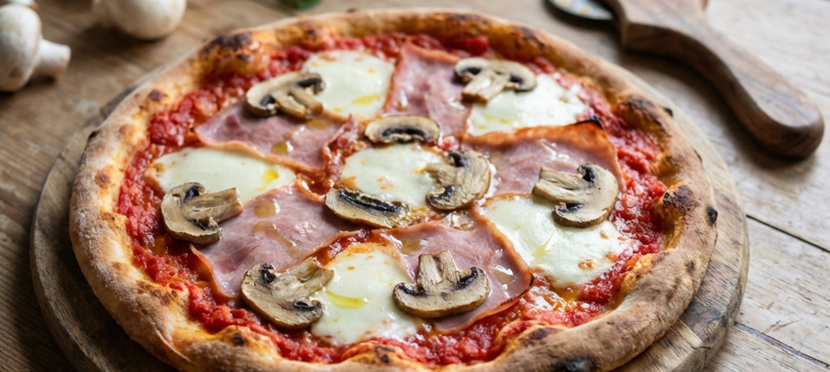 - 3Spread the pizza dough with the tomato mixture, then top with the sliced mozzarella. Finally, add the ham and mushroom slices and drizzle with another spoon of oil. Bake the pizza on a baking tray or pizza stone for a maximum of 4-5 minutes in a preheated oven.