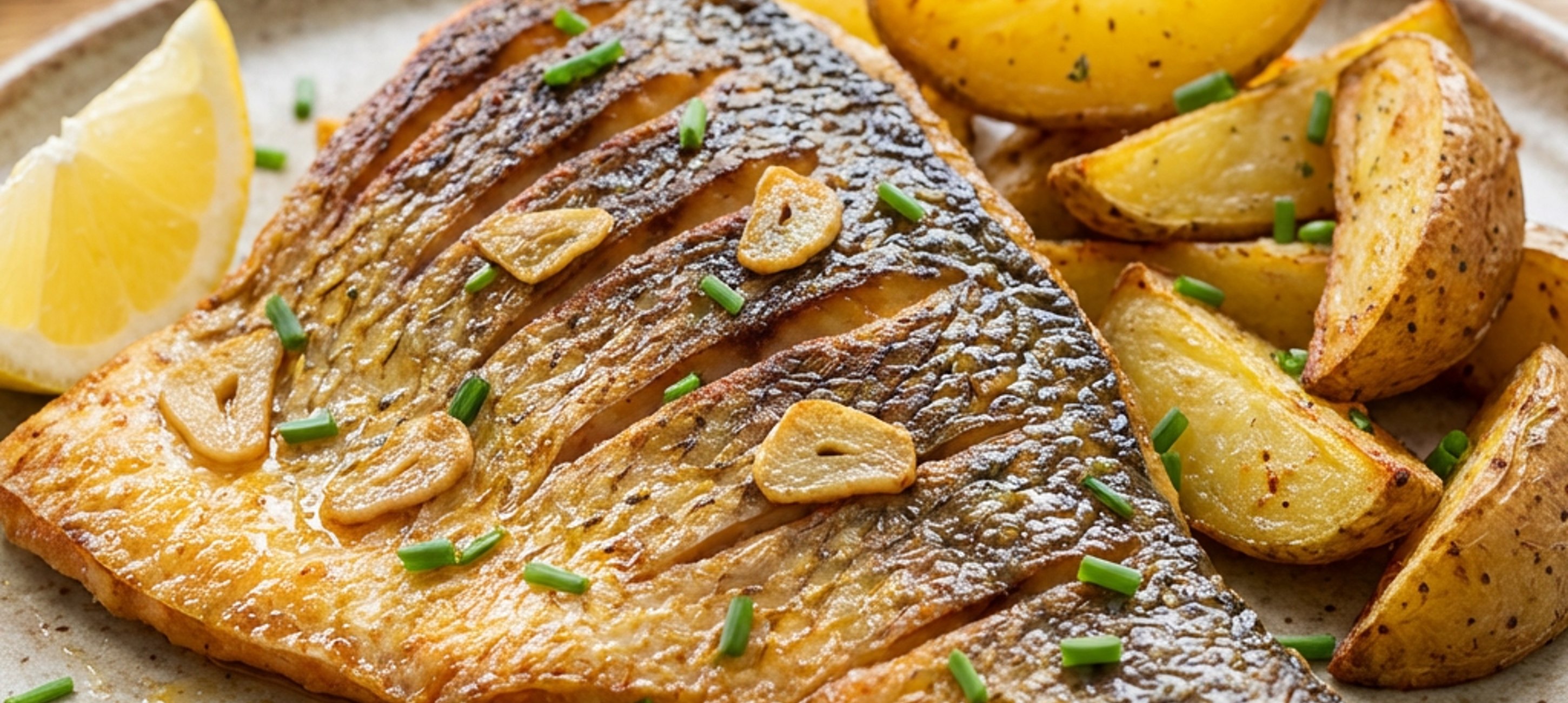 - 3Heat the fat in a pan over low heat. Place the fish in the pan, skin-side down first, and fry for four minutes. Then flip them, add the sliced potatoes to the pan, and fry together with the fish for 4-5 minutes until everything is golden brown.