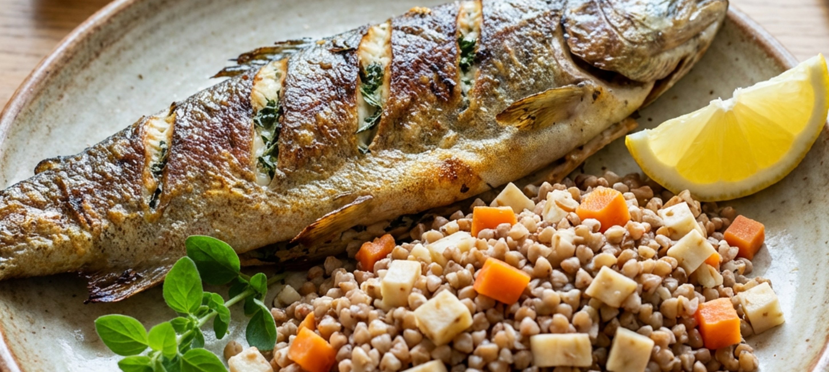 The fish can also be coated in corn flour, making it gluten-free. Instead of buckwheat, you can use lentils, but the recipe also works with bulgur and quinoa.