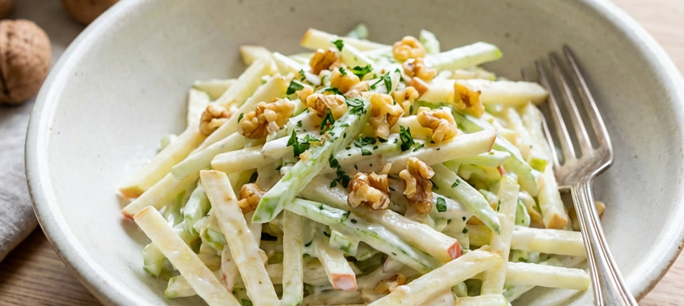 - 3Cut the apple into strips the same way as the celery, chop the meat finely, and roughly chop the walnuts.