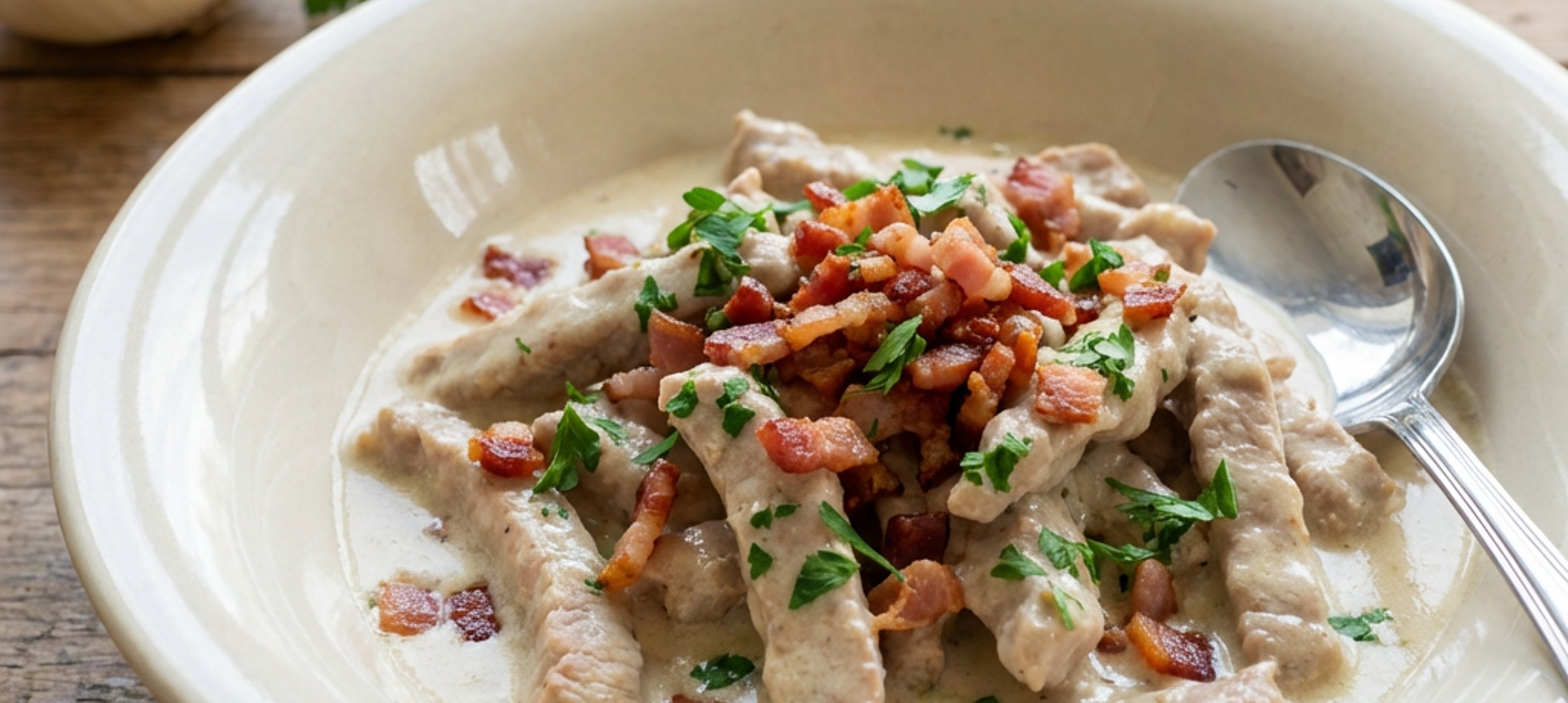 - 3In a large pan or pot, heat the oil over high heat. As soon as the oil starts to smoke slightly, add the meat and sear for 2 minutes. Add pepper, onion, and bacon, mix and cook for 1 minute, stirring frequently. Add the garlic and sear for another 1 minute. Add wine and cook for another 2 minutes, stirring frequently. Add the cream, reduce the heat and cook for an additional 2 minutes.