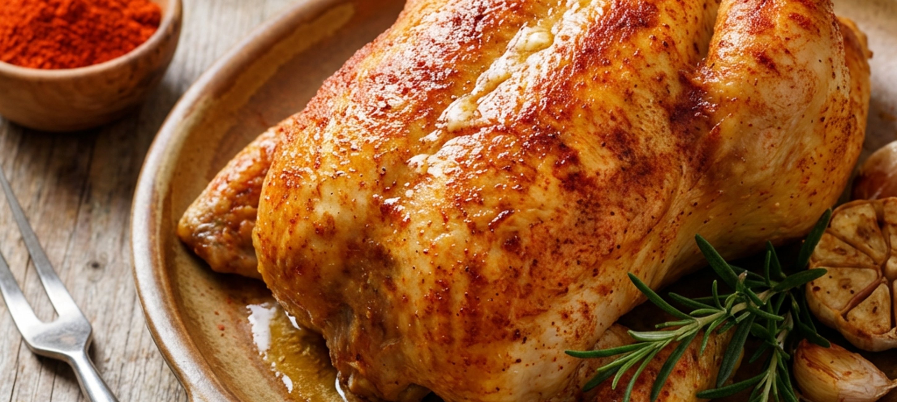 - 7You can place thyme or rosemary sprigs and bay leaves inside the chicken. You can also add thyme, rosemary, peeled onion, peeled garlic, or a few slices of bacon to the baking tray. You can add a teaspoon of dried garlic or a tablespoon of milk powder to the salt and paprika mixture, which will make the skin even crispier after roasting. You can replace the paprika with curry spices. Do not open the oven too often during roasting, as this can increase the total cooking time. Baste the chicken three times during the second half of the roasting time.