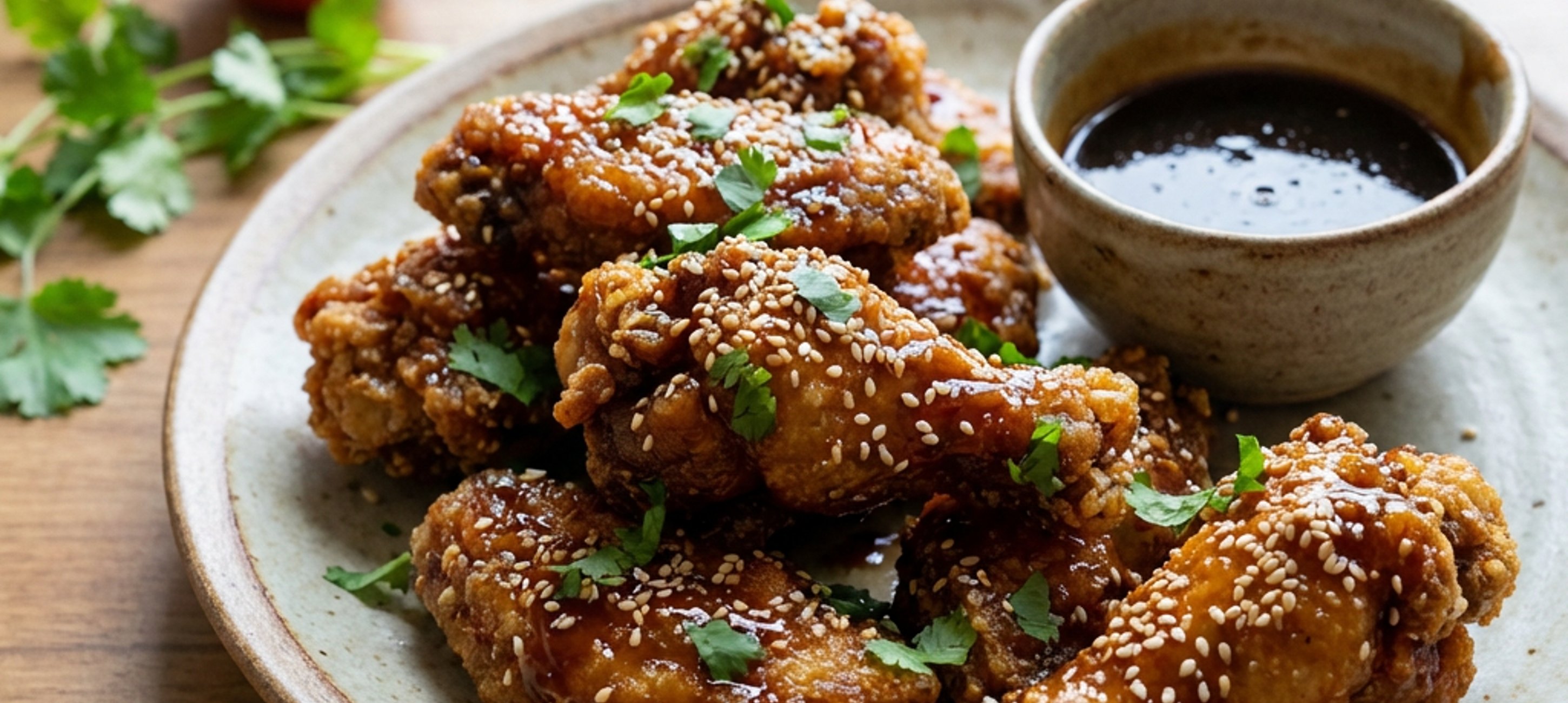 - 2Lightly toast the sesame seeds in a dry pan and mix them with the chopped coriander in a bowl. First, toss the fried chicken wings in the sauce, then in the coriander-sesame seed mixture.