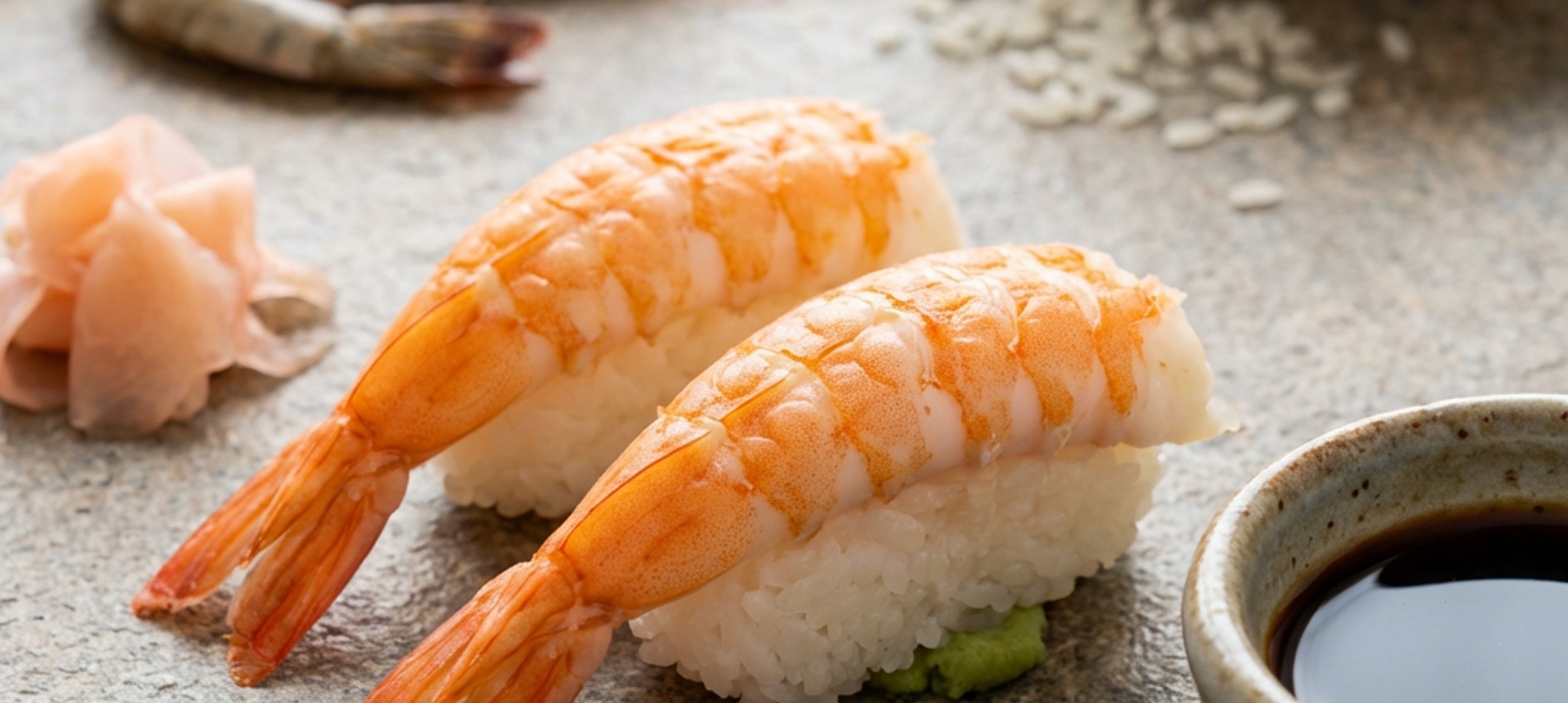 Dip the shrimp nigiri into soy sauce flavoured with wasabi paste and eat pickled ginger with it.