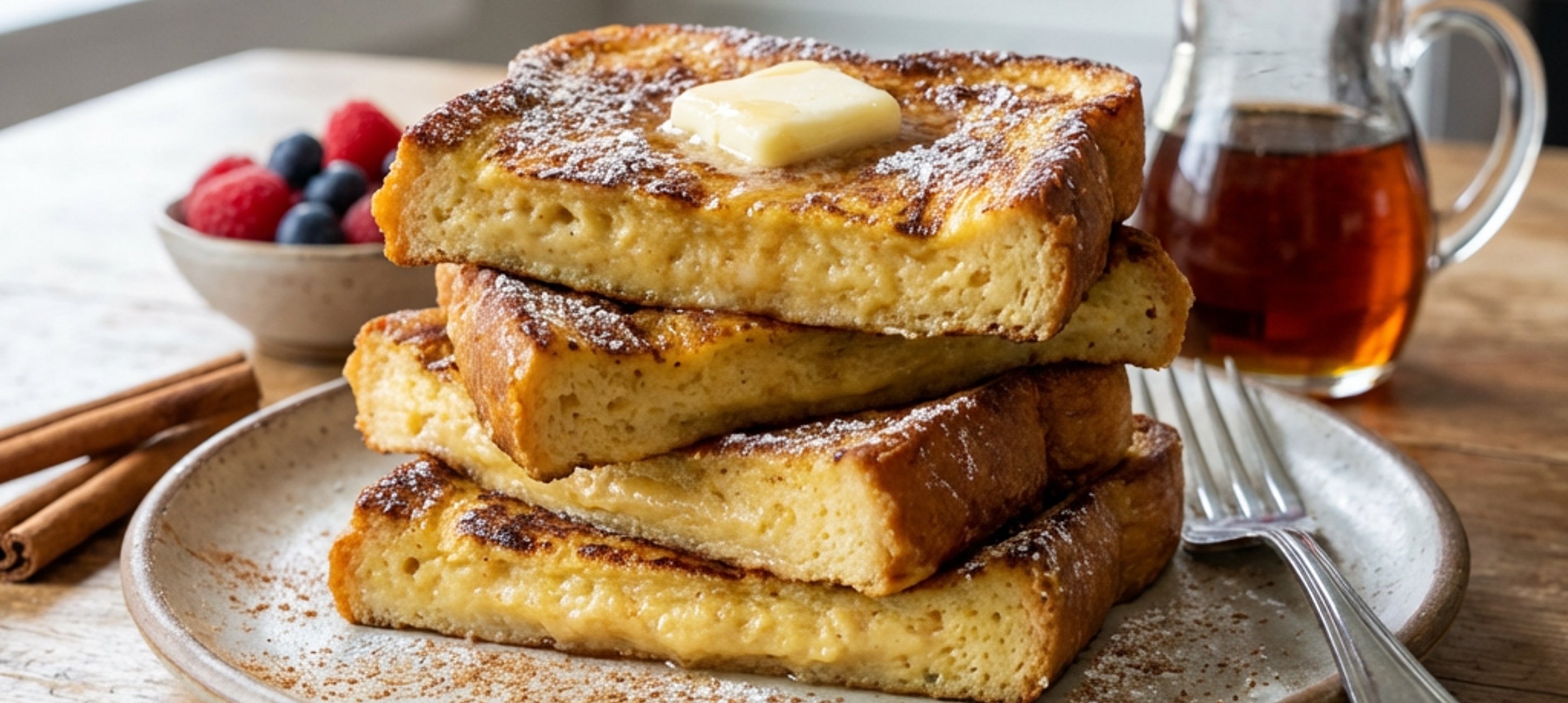 Fresh fruit is ideal for serving. Put two slices of bread together with a thick layer of jam in the middle, then soak both slices together in the egg mixture. The result is a sweet sandwich. Drizzle the finished French toast with maple syrup.