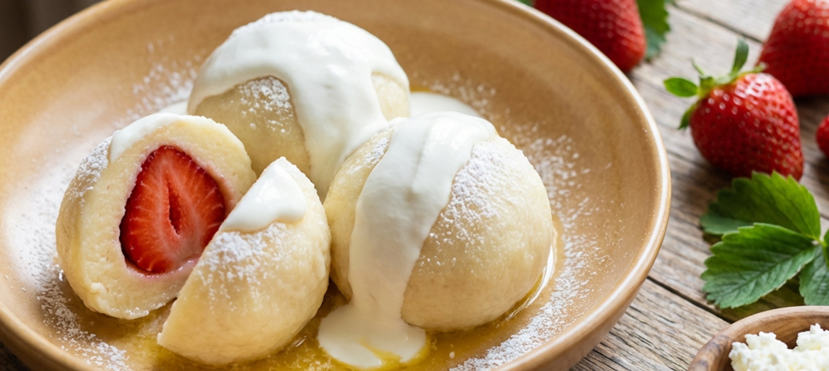- 4Remove the dumplings from the water with a slotted spoon or sieve. Pour sour cream over them, sprinkle with powdered sugar, and drizzle with melted butter.