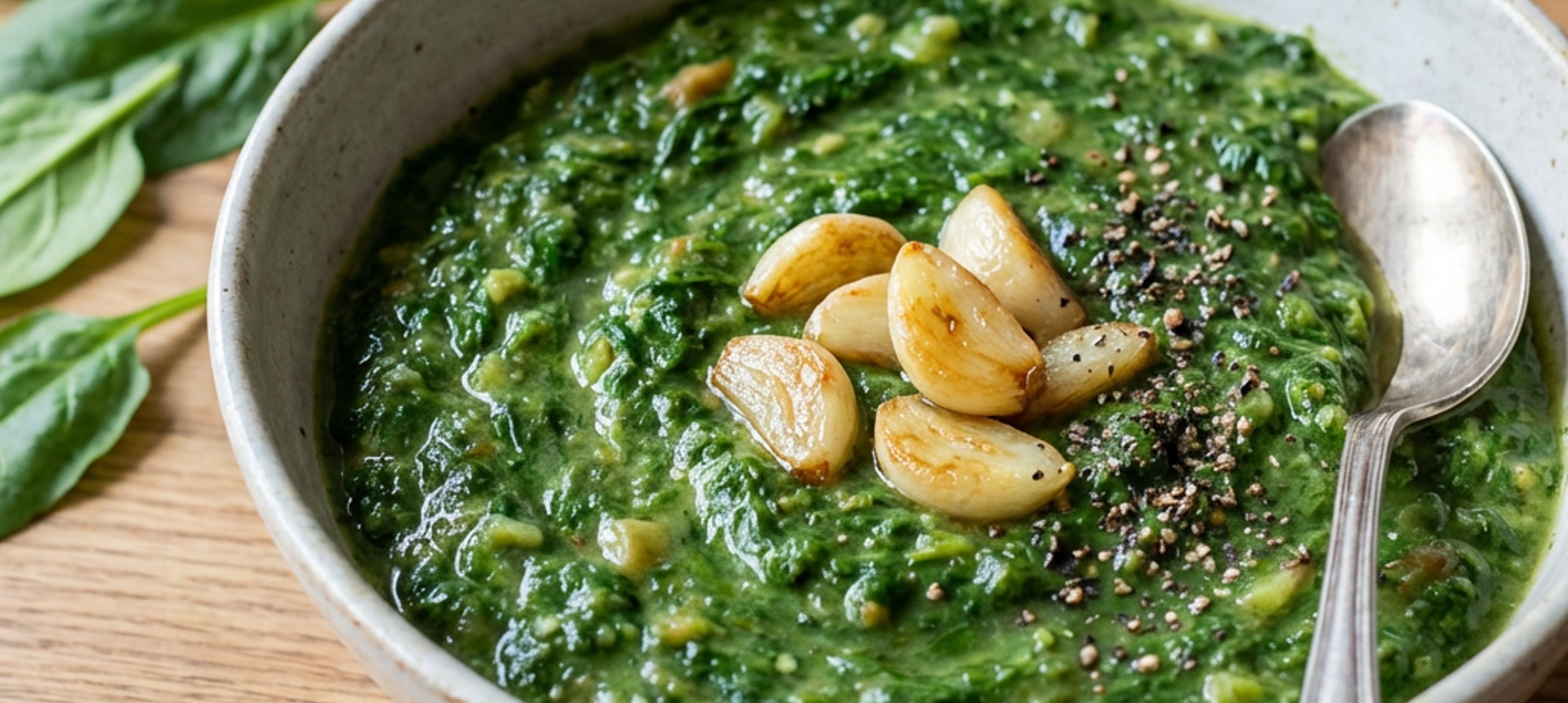 - 1It's best to wash the spinach in a tall pot with cold water, so that any soil or sand sinks to the bottom. Change the water several times. Heat the spinach for a short time; prolonged heat treatment will cause it to turn grey. You can chop the spinach with a knife on a cutting board, but don't make it too fine. If you're not serving it immediately, you can add a little cream to keep its beautiful green color. For the amount mentioned above, 80 ml of cream (min. 31%) is sufficient; just bring it to a boil in the spinach pot, stir, and remove from heat.