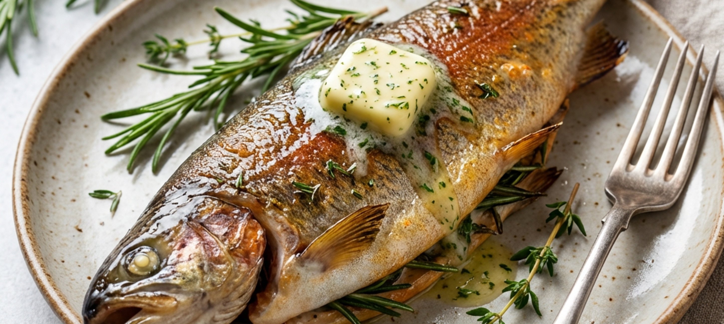 - 3Place the herbs and 20 g of butter inside the fish. Lay it on a baking tray lined with baking paper with 20 g of butter. Bake for 15 minutes. Serve the fish immediately, while still warm, with butter on top.