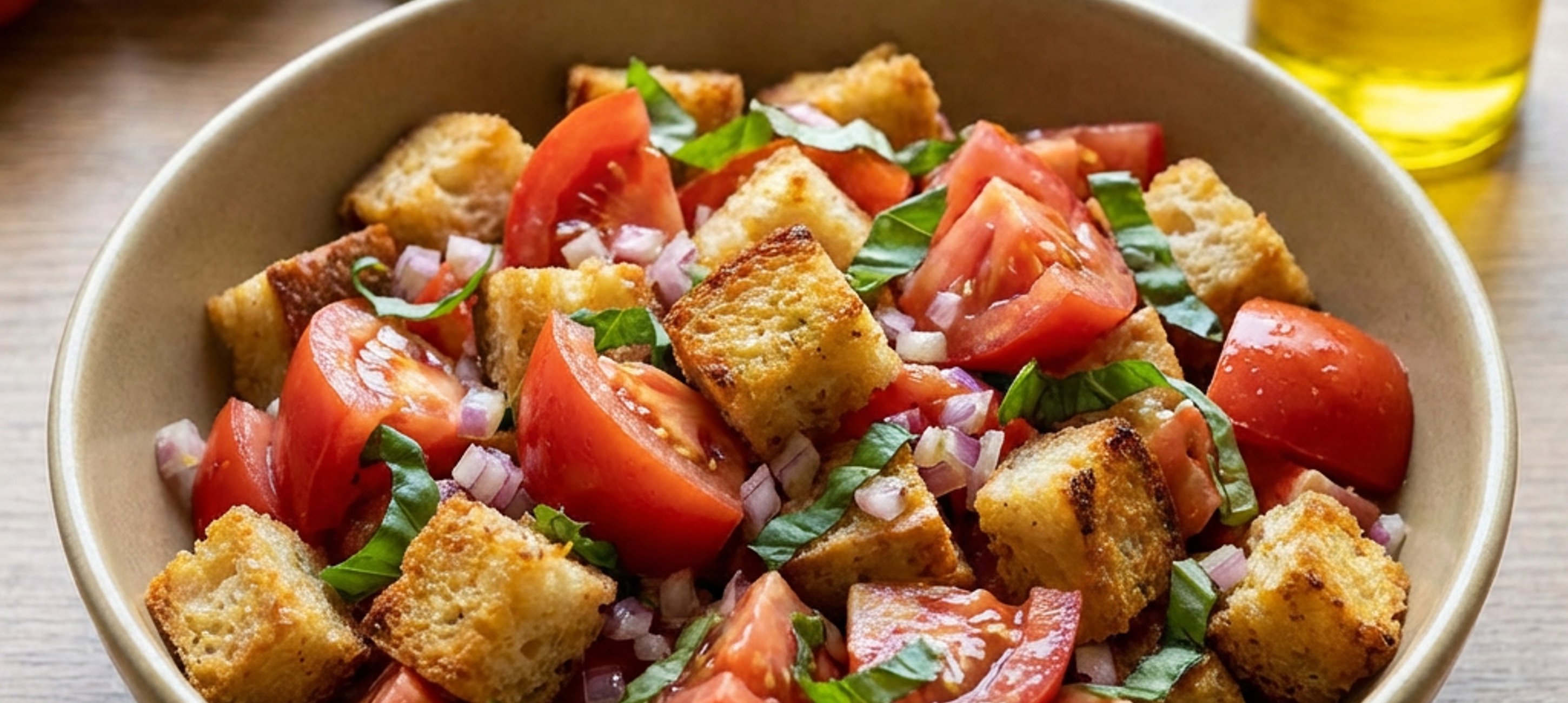 - 4Place the chopped tomatoes, onion, and basil in a bowl, then season with salt and pepper. Add the toasted bread pieces, drizzle with a little red wine vinegar and olive oil. Mix the salad and let it rest at room temperature. Stir again before serving.