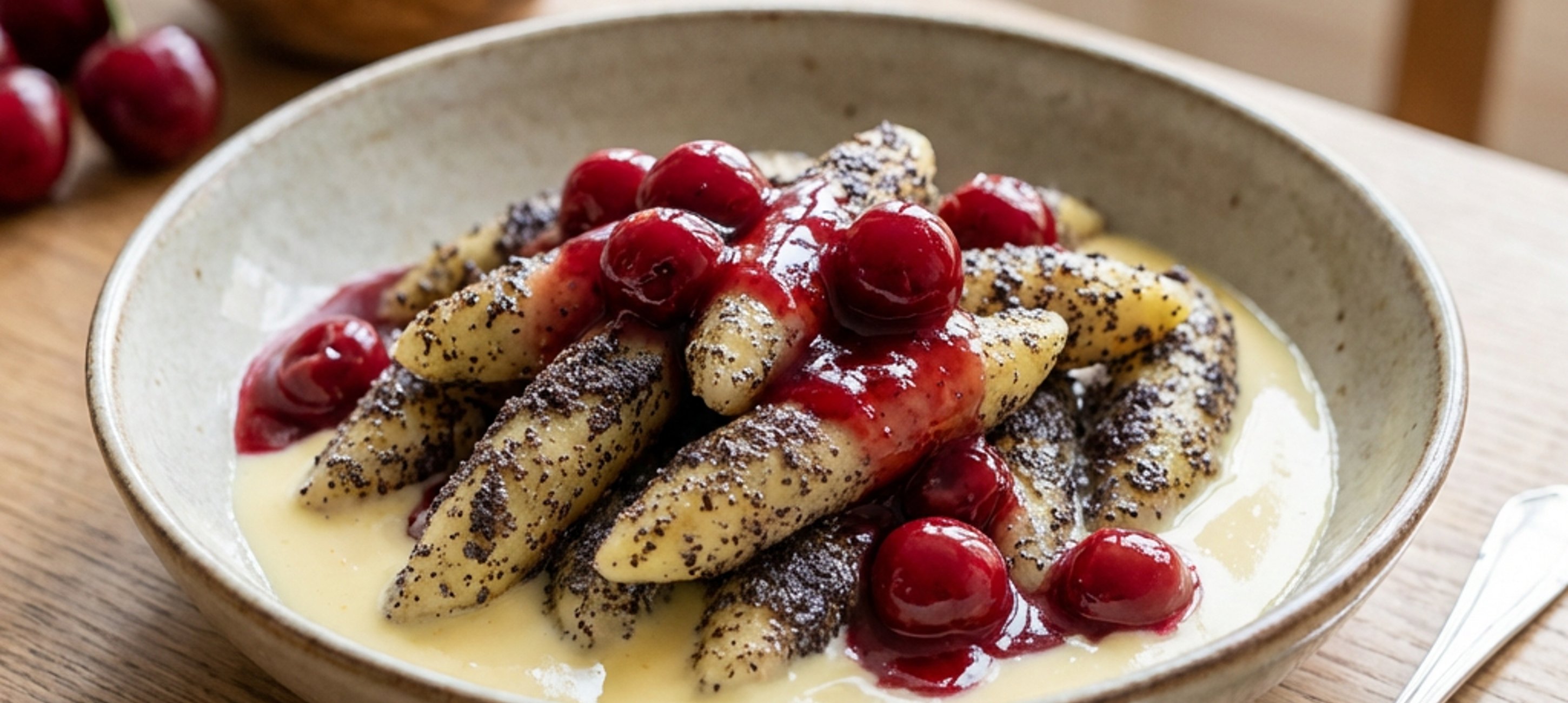 Serve the nudli with the cherry ragout, sugared poppy seeds, and vanilla custard.