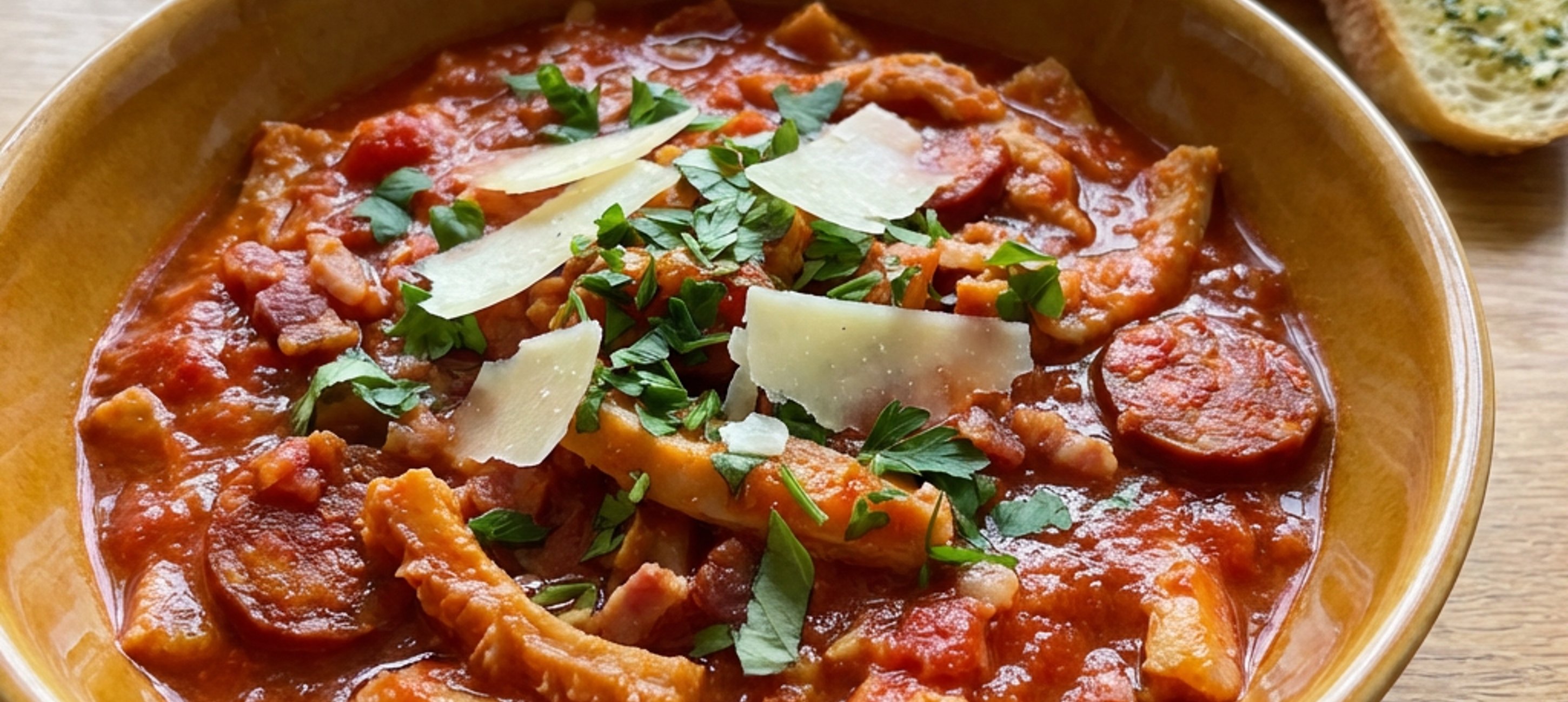 - 1Fry the Kolozsvári bacon, sliced into strips, in a heavy pan until crispy, then add the chopped onion and crushed garlic, sauté them, and then pour in the canned tomatoes.