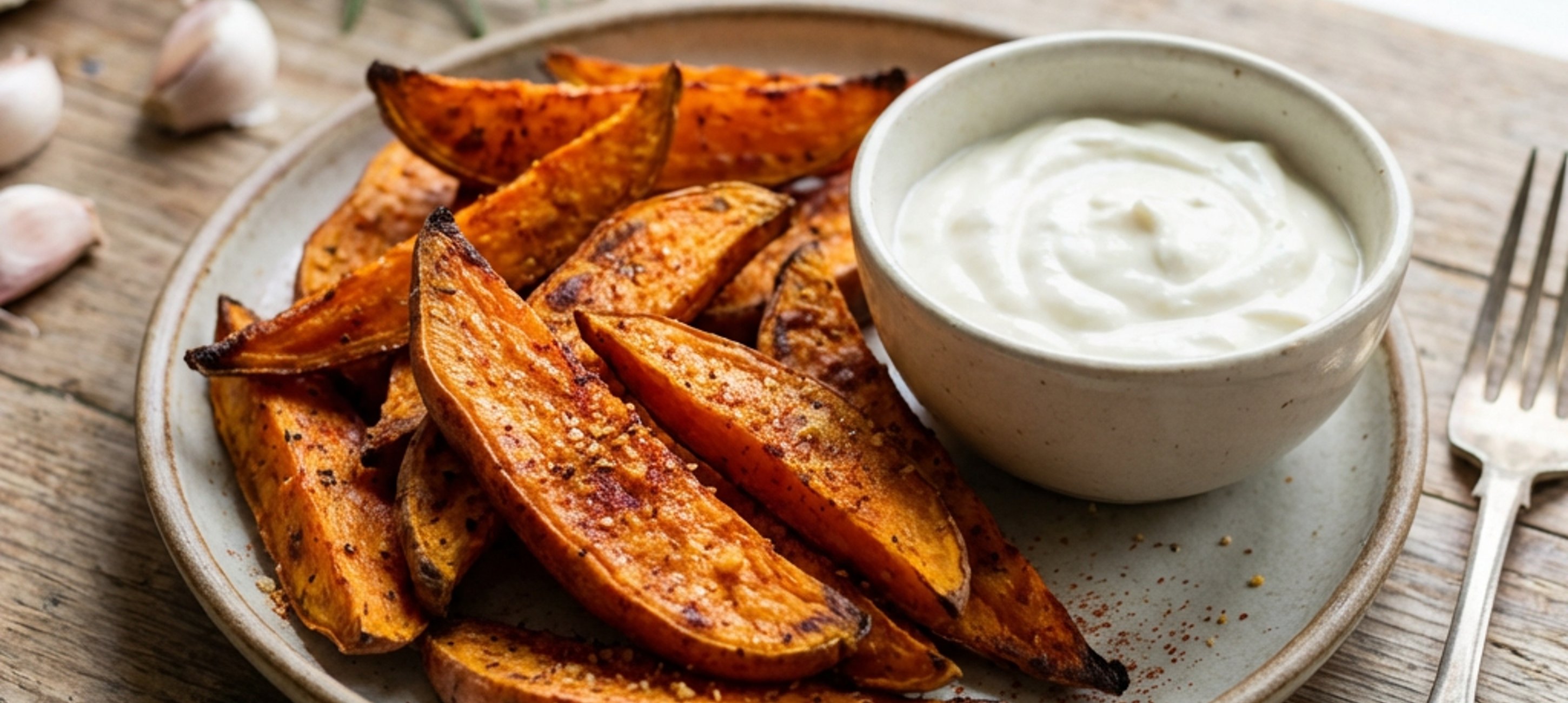 Wash the sweet potatoes and cut them into sticks. In a bowl, mix them with olive oil. Combine all the spices, pour over the potatoes, and mix thoroughly by hand to ensure even coating on each stick. Spread them out on a baking tray lined with baking paper.