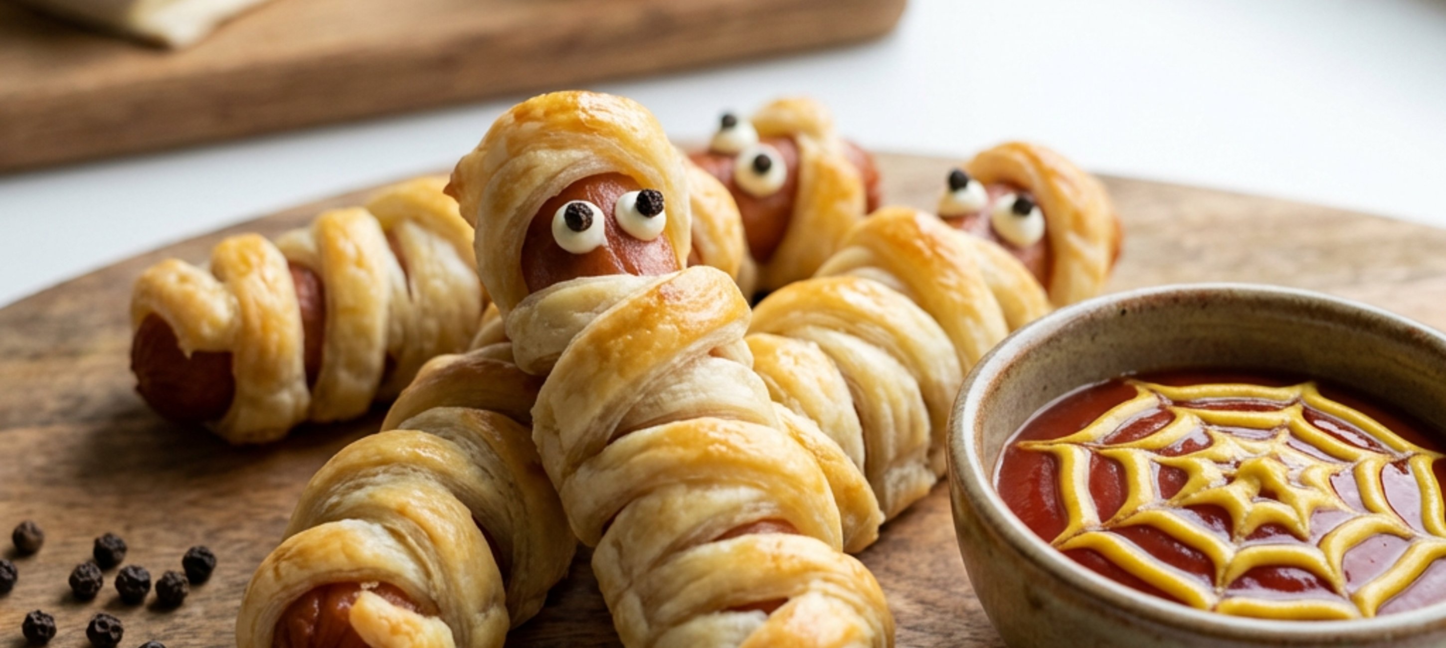 - 1Unroll the puff pastry and cut it lengthwise into strips about 1 cm wide. Wrap the sausages with the puff pastry strips. You will need 2-3 puff pastry strips per sausage. Leave 0.5 cm space on the top third of the sausages for the mummies' eyes.