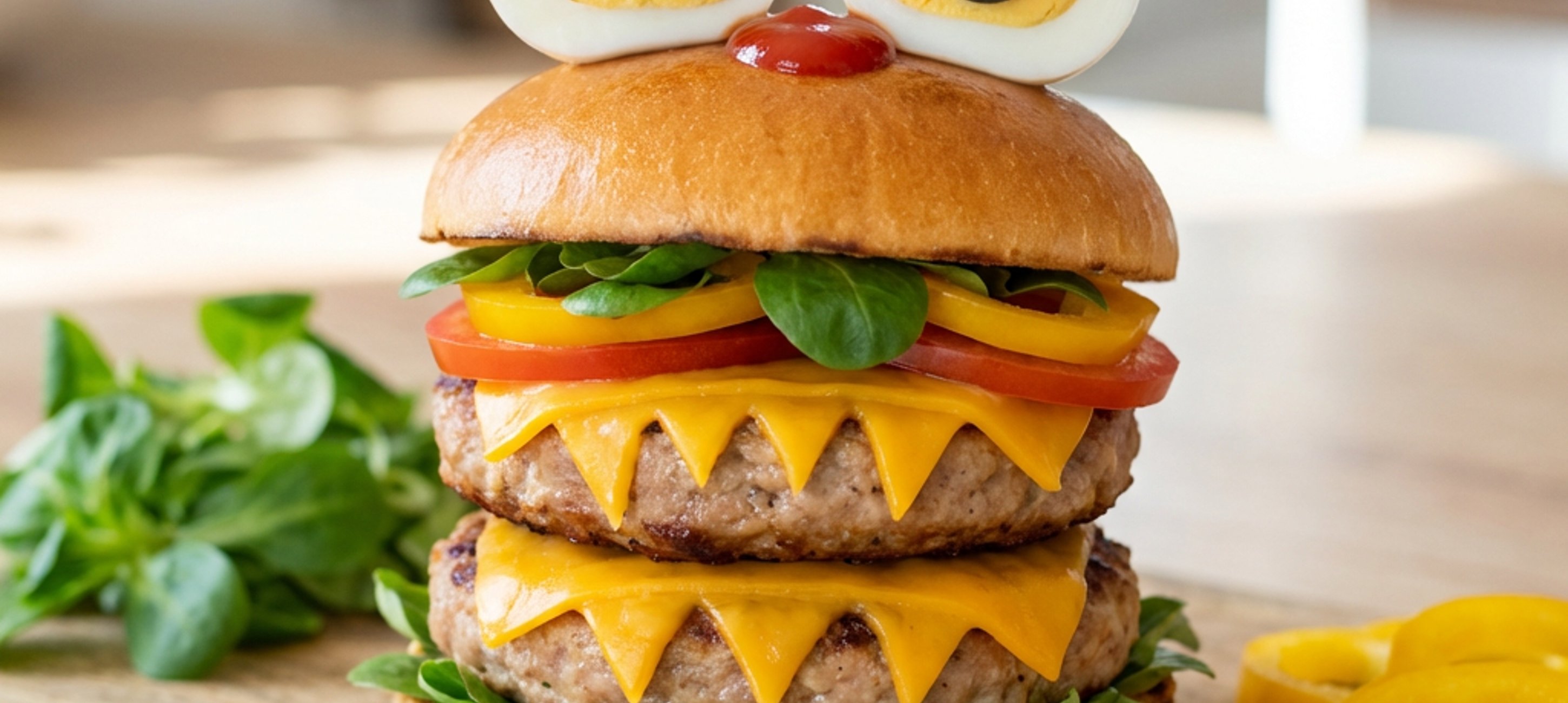 - 5To assemble the Monster Burger, spread 1 tablespoon of ketchup on the bottom half of the bun. Add a handful of lamb's lettuce, the tomato slices, and a few slices of bell pepper. Spread another 1 tablespoon of ketchup. Place one meat patty on top, then another bell pepper slice and lamb's lettuce, followed by the cucumber slices. Place the other meat patty and the cheese on top, then spread with the remaining ketchup, and finally cover with the top half of the bun.