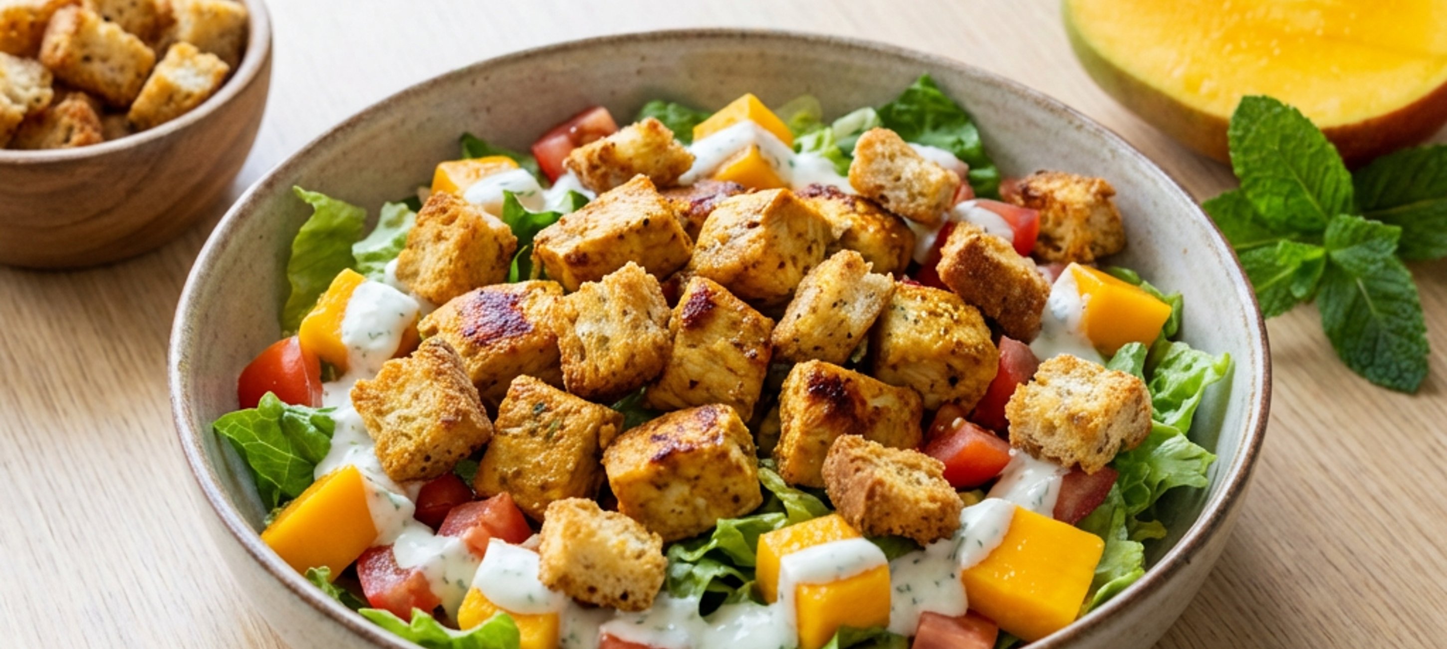 - 6Add the yogurt dressing and croutons to the salad, then mix everything together.