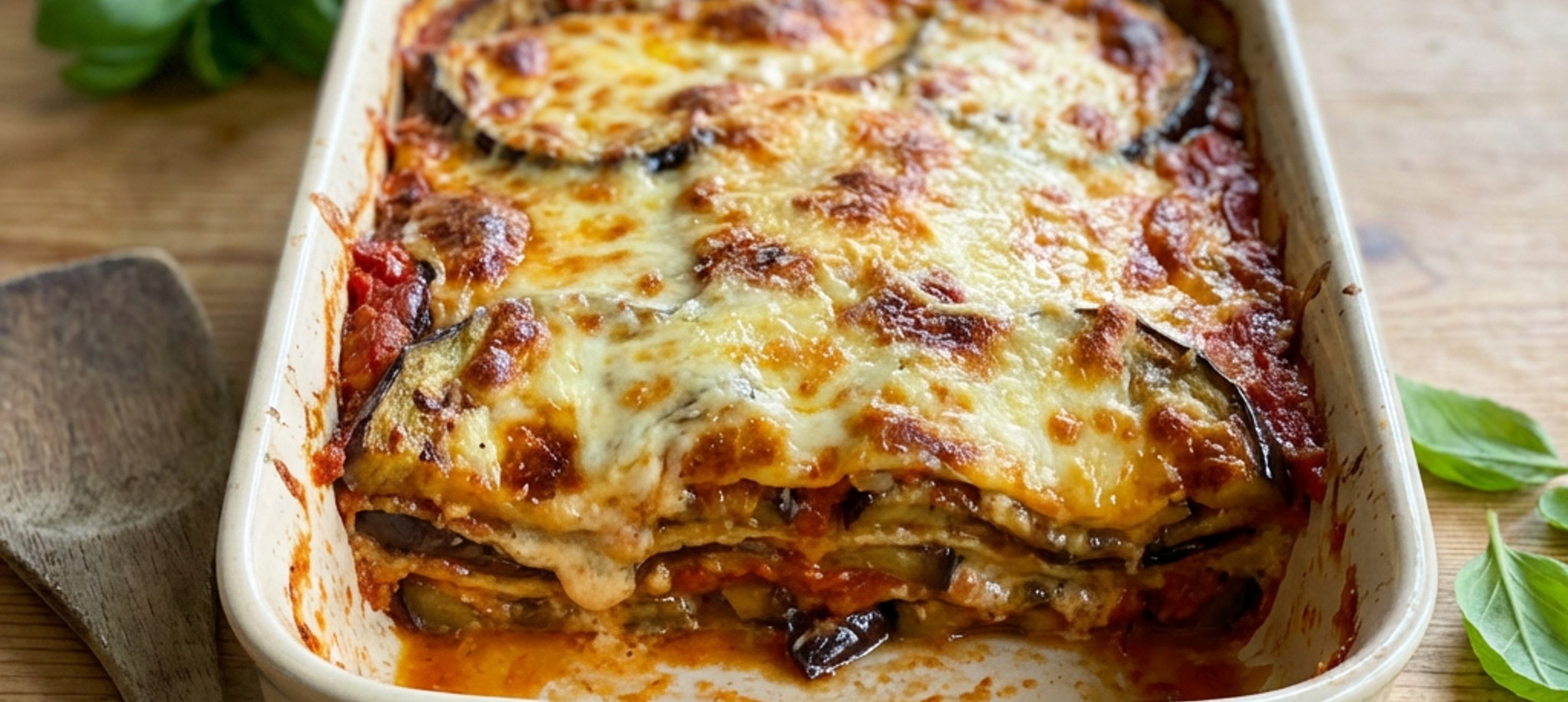 - 5Now that all ingredients are prepared, start layering them. Line the bottom of a 20x30 cm dish with about 1/3 of the roasted eggplants. Cover them with the pasta sheets and spread 1/3 of the tomato mixture, then 1/3 of the béchamel. Repeat this two more times. Sprinkle the last layer of sauce with the remaining Parmesan cheese and place the sliced mozzarella on top. Cover the dish with aluminum foil and bake in the oven for about 50 minutes. Halfway through the baking time, remove the foil and let the cheese crisp up. After baking, add the remaining basil leaves.