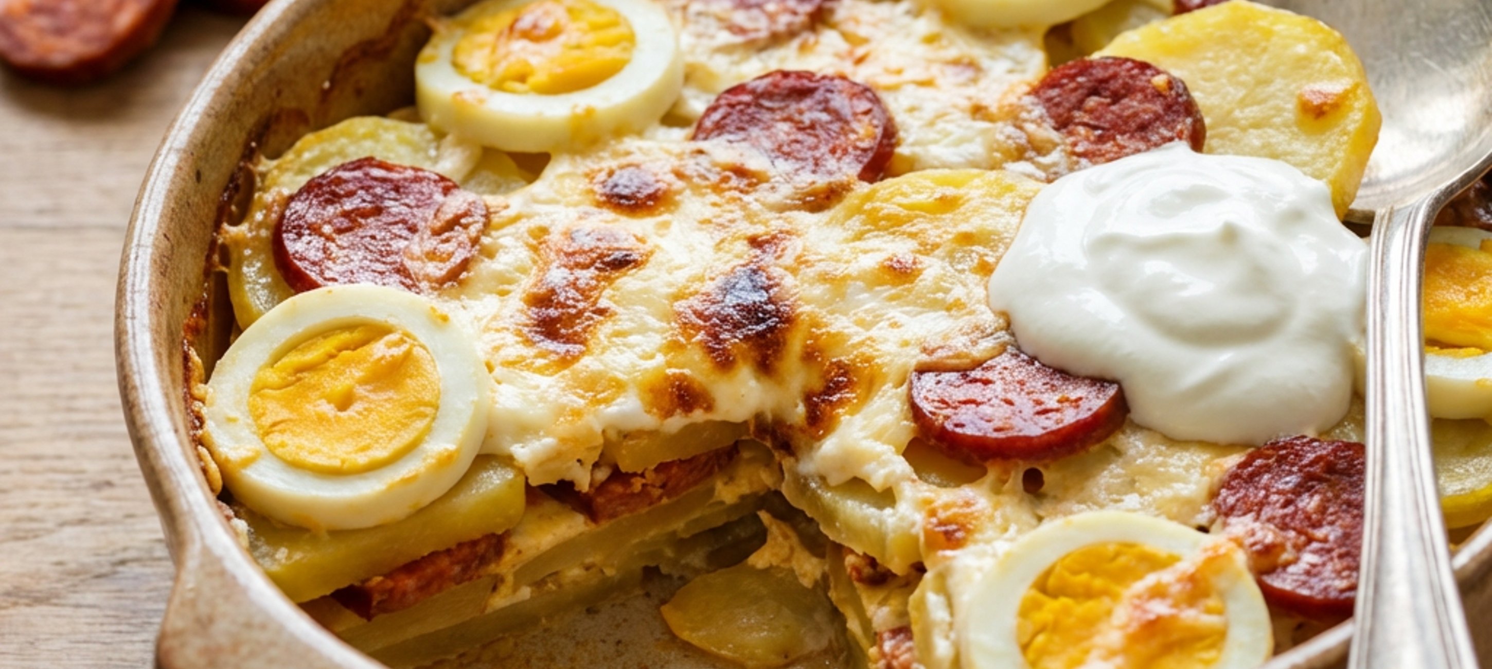 Grease an ovenproof dish with any fat of your choice, add a layer of potatoes, season with salt, then add the sliced hard-boiled eggs and the sliced sausage, another layer of potatoes, drizzle with a few spoonfuls of the sour cream mixture, and start layering again. Continue this until all ingredients are used up, with sour cream on top.