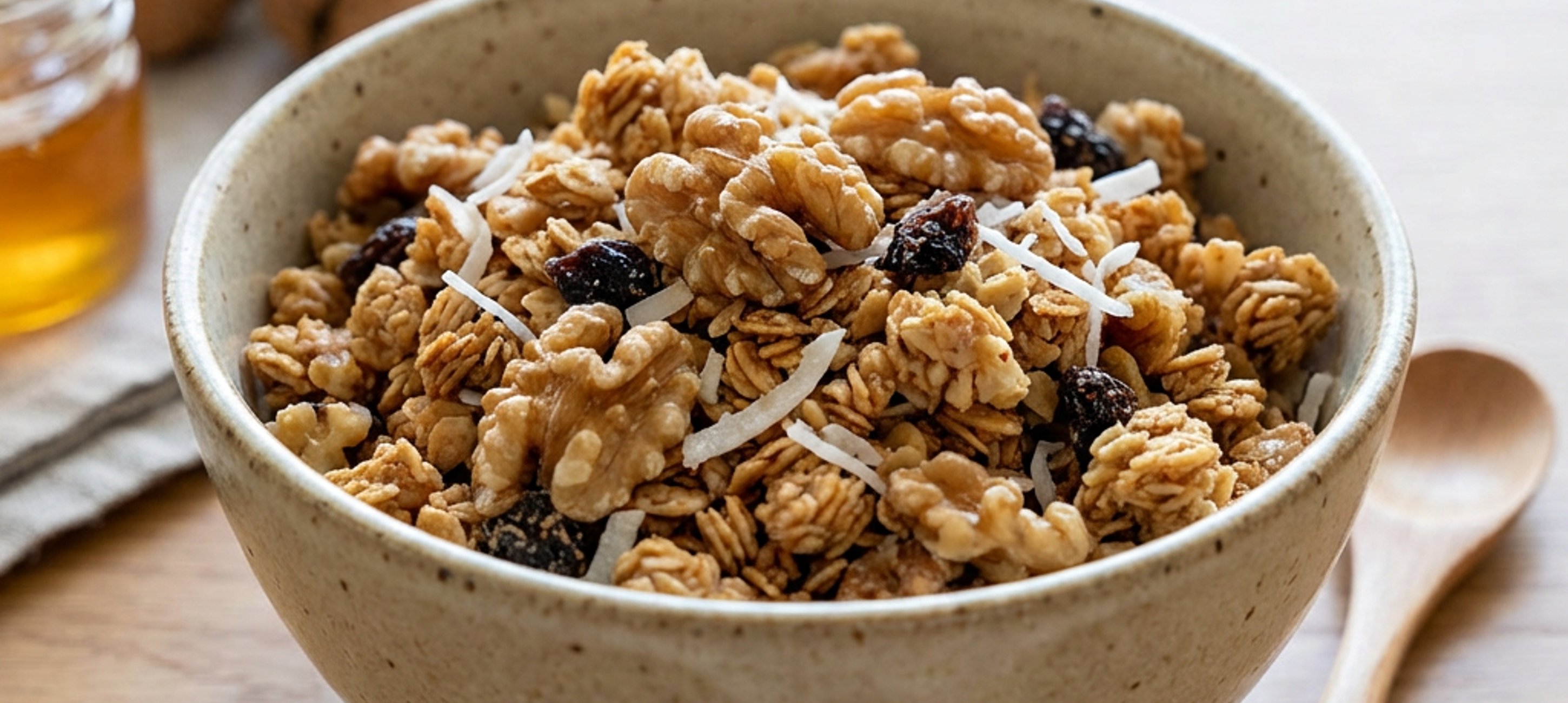 Mix the oats, walnuts, and shredded coconut, then add the dried fruit.