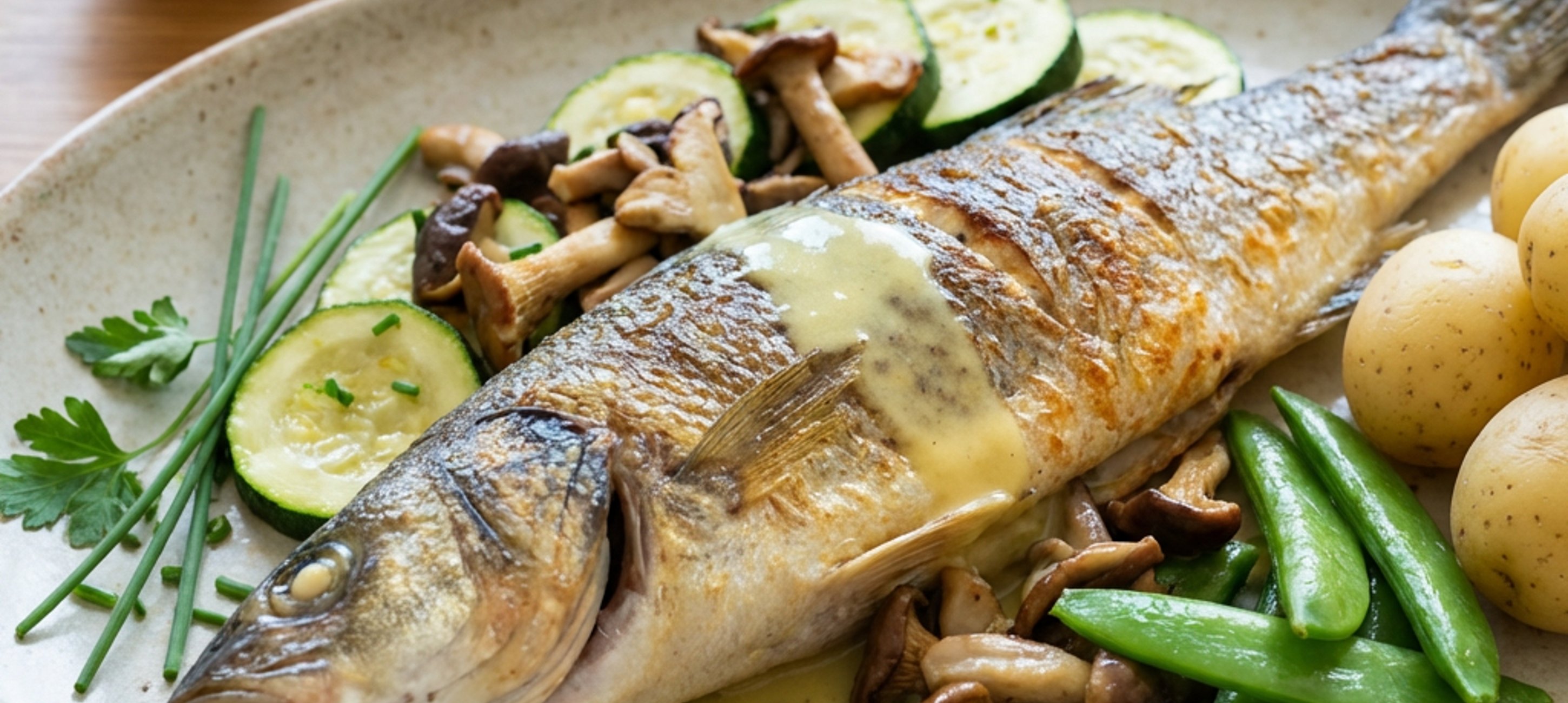 - 10A megsült halat a zöldségekkel és a vajmártással találjuk.