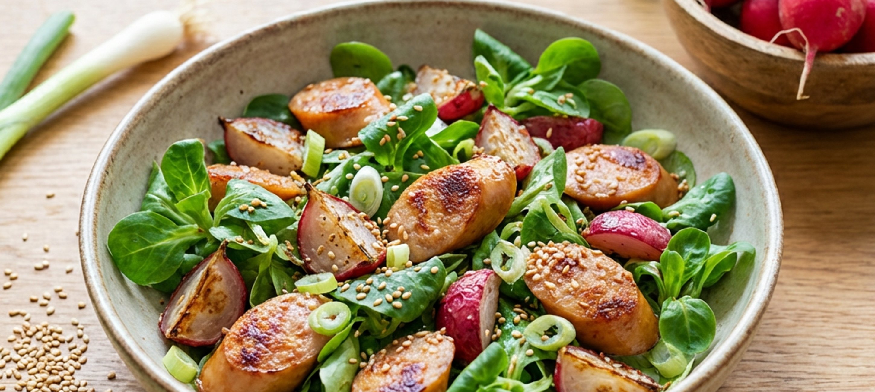 - 5Sprinkle with toasted sesame seeds, then cover with the sausage slices.