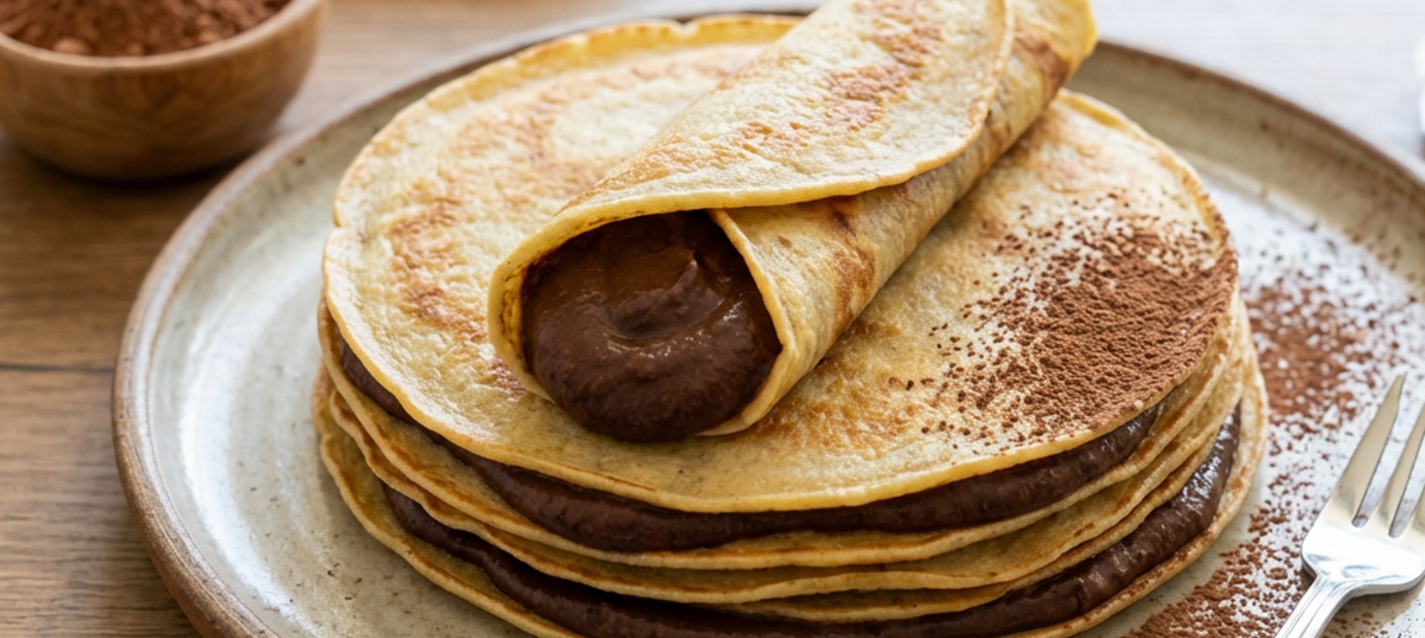 Blend the banana with the cocoa powder and sweetener until a homogeneous mixture is formed. Whip the whipping cream, then add it to the banana mixture. Mix until a smooth cream is obtained, then fill the crepes with it.