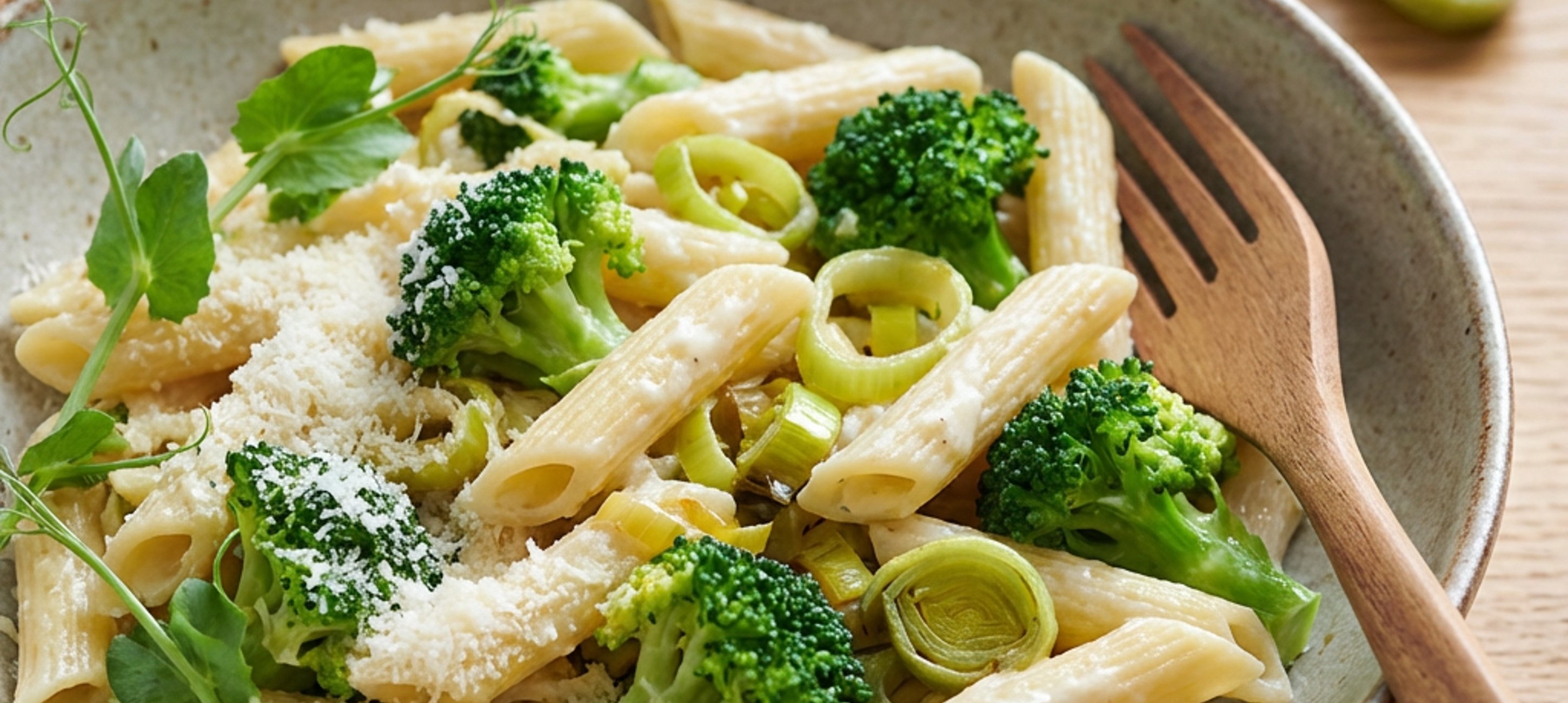 Once two-thirds of the liquid has boiled off, add the cream, season with salt and pepper, and continue to simmer until you get a thin sauce. Then, using a strainer, transfer the al dente pasta into it and mix thoroughly. Add the broccoli, sprinkle with Parmesan, and serve.