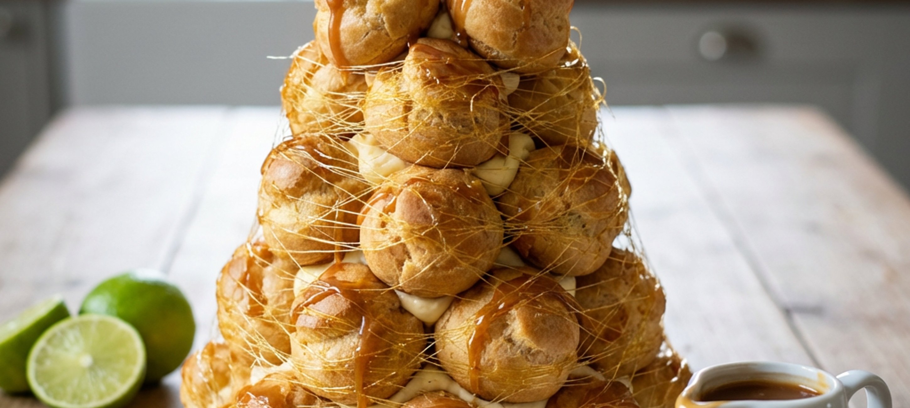 - 8Build a pyramid from the filled choux pastries with the creamy caramel sauce.