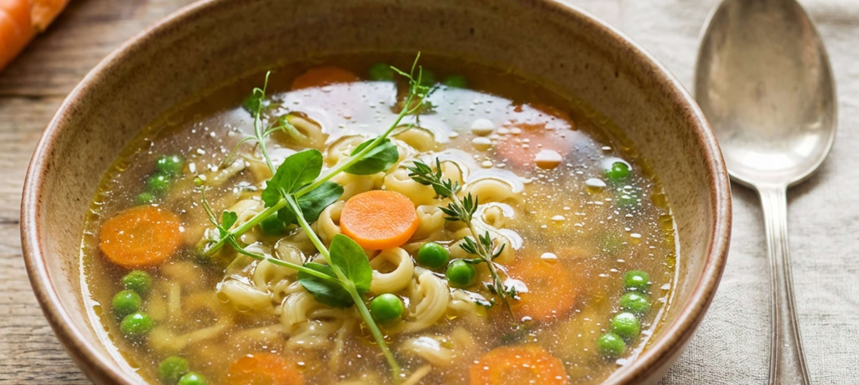 Cook the pasta in salted water, drain it, and serve immediately with the meats, peas, vegetables, and hot soup, generously sprinkled with fresh herbs, e.g., parsley or chives.
