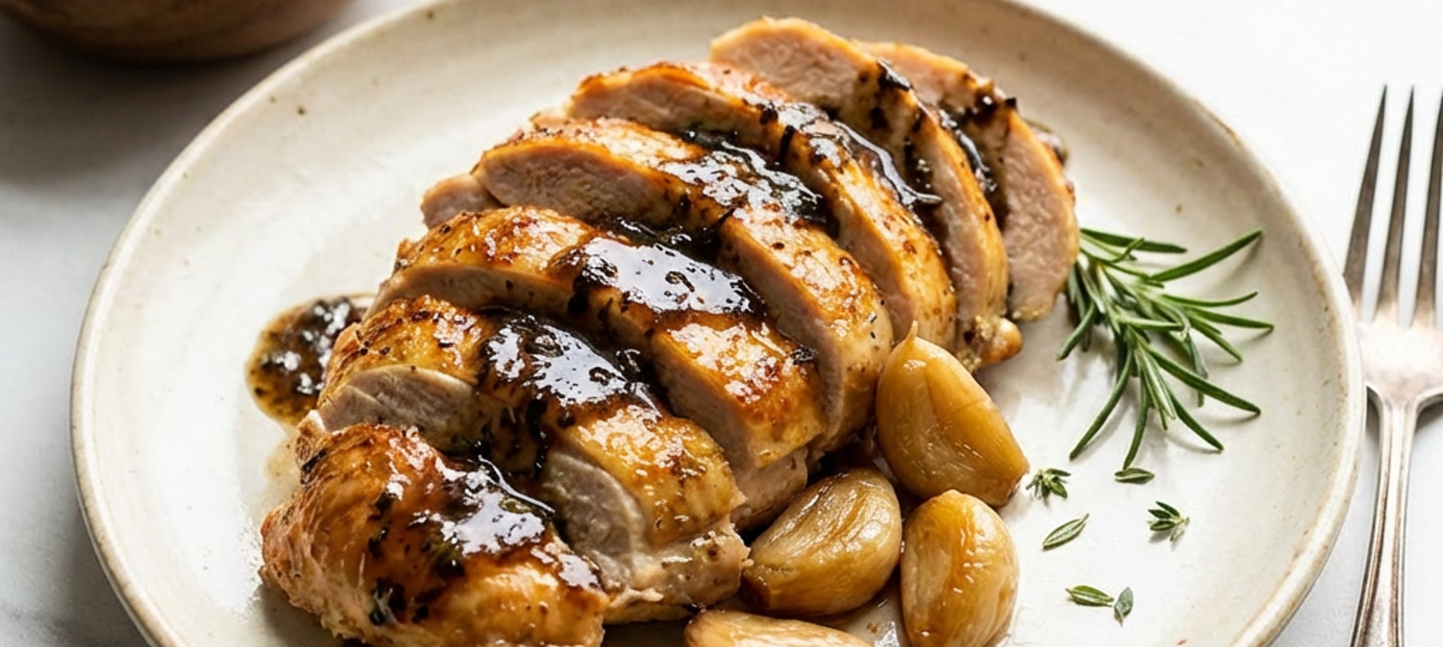 - 7Remove the meat from the brine, sear it all around in an oven-safe pan with the garlic fat, then place the meat in a 170-degree Celsius oven for 1-2 hours, depending on its size. The easiest way is to measure the internal temperature of the meat with an inexpensive meat thermometer. In this case, bake until the internal temperature reaches 62 degrees Celsius. Then let it rest, slice it, and serve with the garlic gravy and confit garlic.