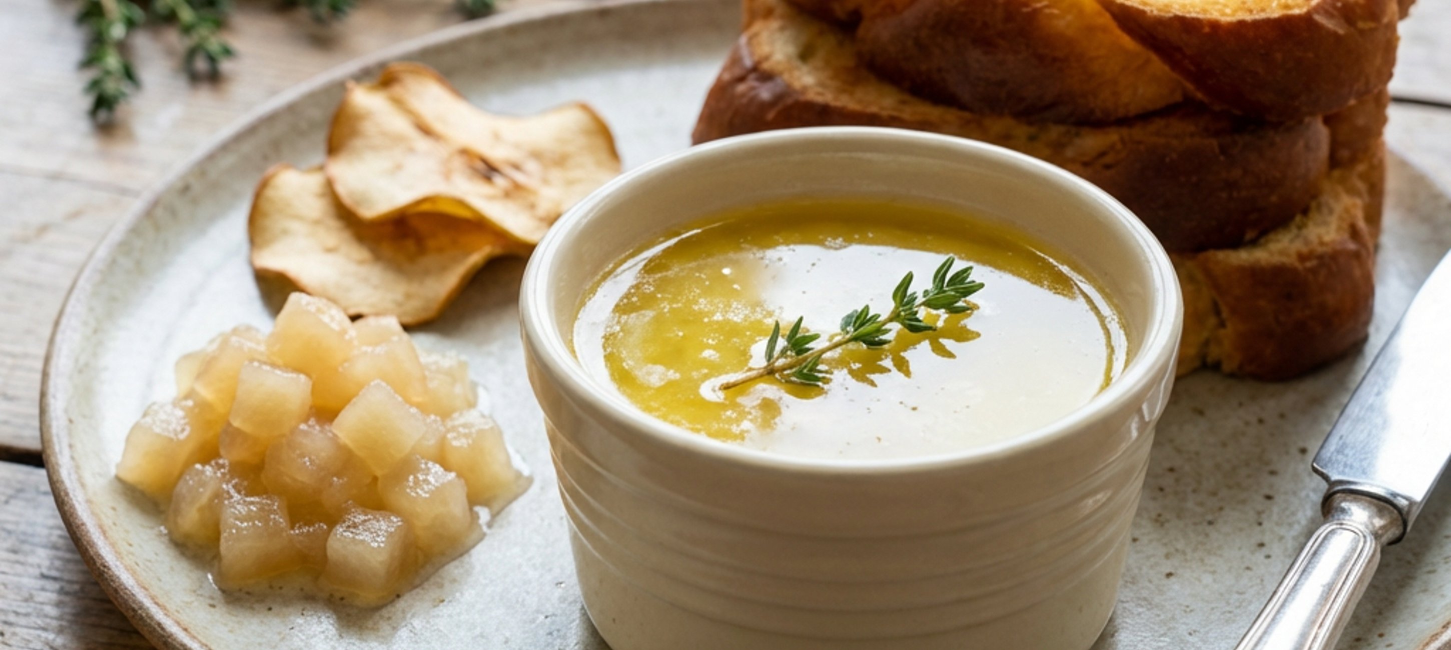 - 3Let it cool, remove the thyme sprig, season with salt, and blend with the remaining room-temperature butter, then pass through a sieve.