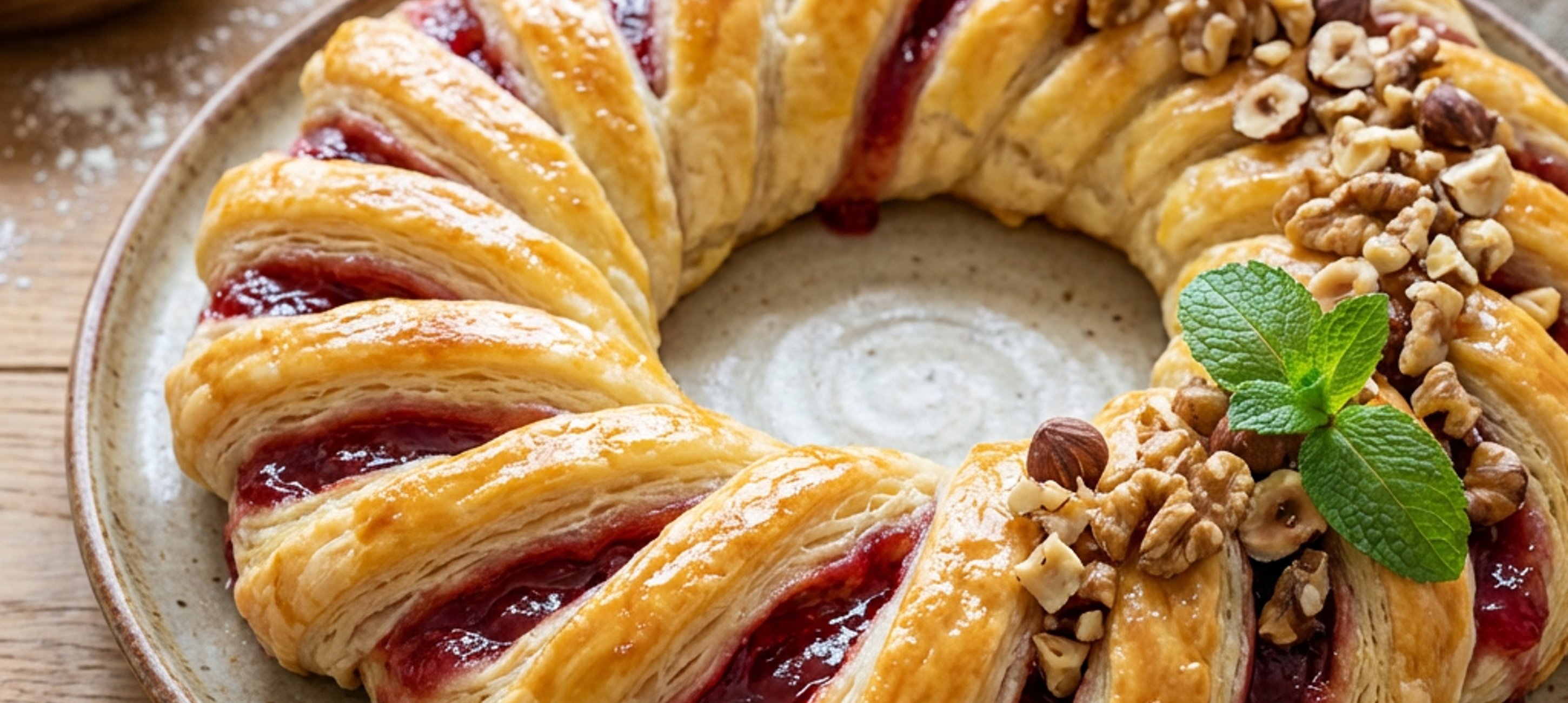 - 3Form it into a wreath, brush with beaten egg, then sprinkle with chopped nuts. Bake at 200 degrees Celsius for 20-25 minutes until golden.