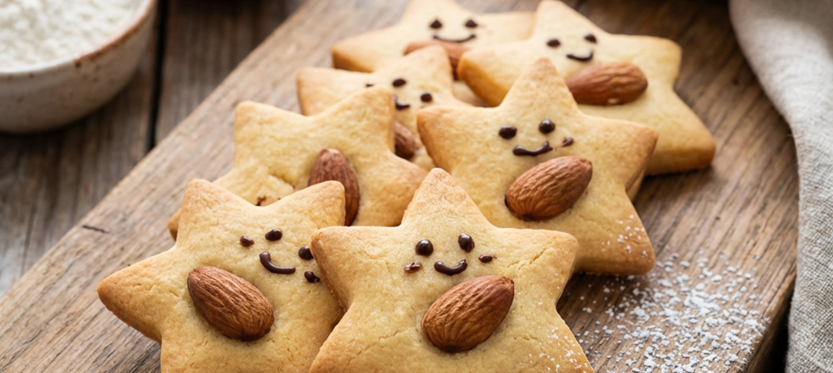 - 3Roll out to 2 mm thickness, then cut out shapes and place an almond on one arm of each star.