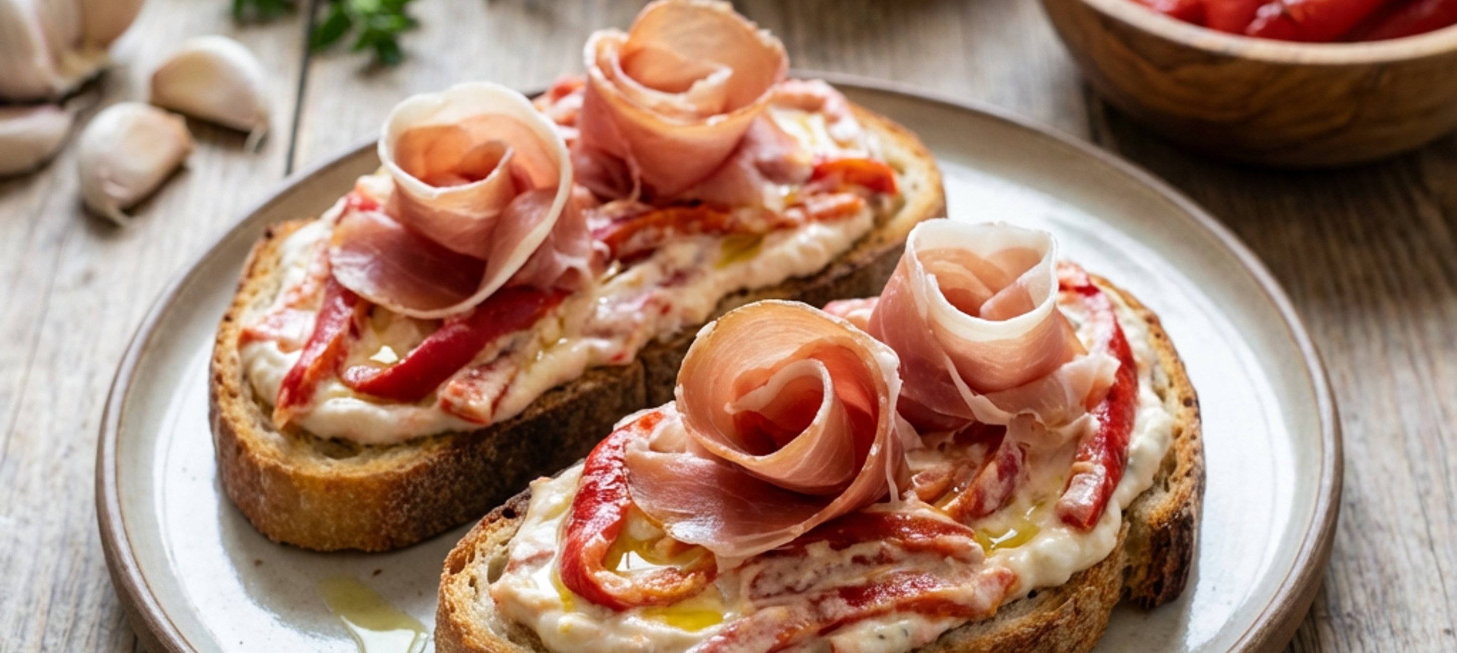 - 4Drizzle the toast with olive oil, pile the roasted pepper salad on top, arrange the ham roses, and garnish with a few nice leaves or fresh herbs.
