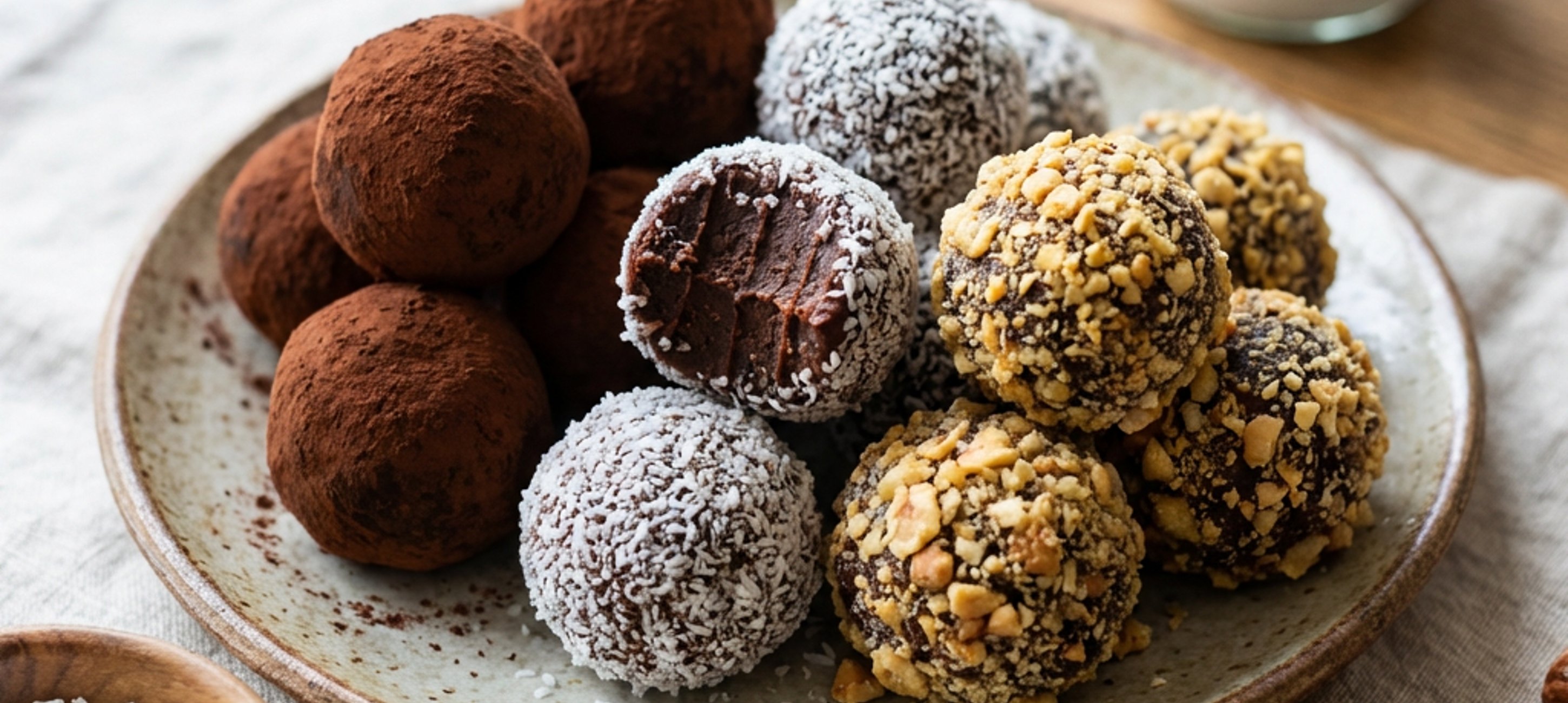After that, it can go into the fridge. Once it starts to solidify, I formed balls from it, which I rolled in ground hazelnuts, shredded coconut, and sugar-free cocoa powder.