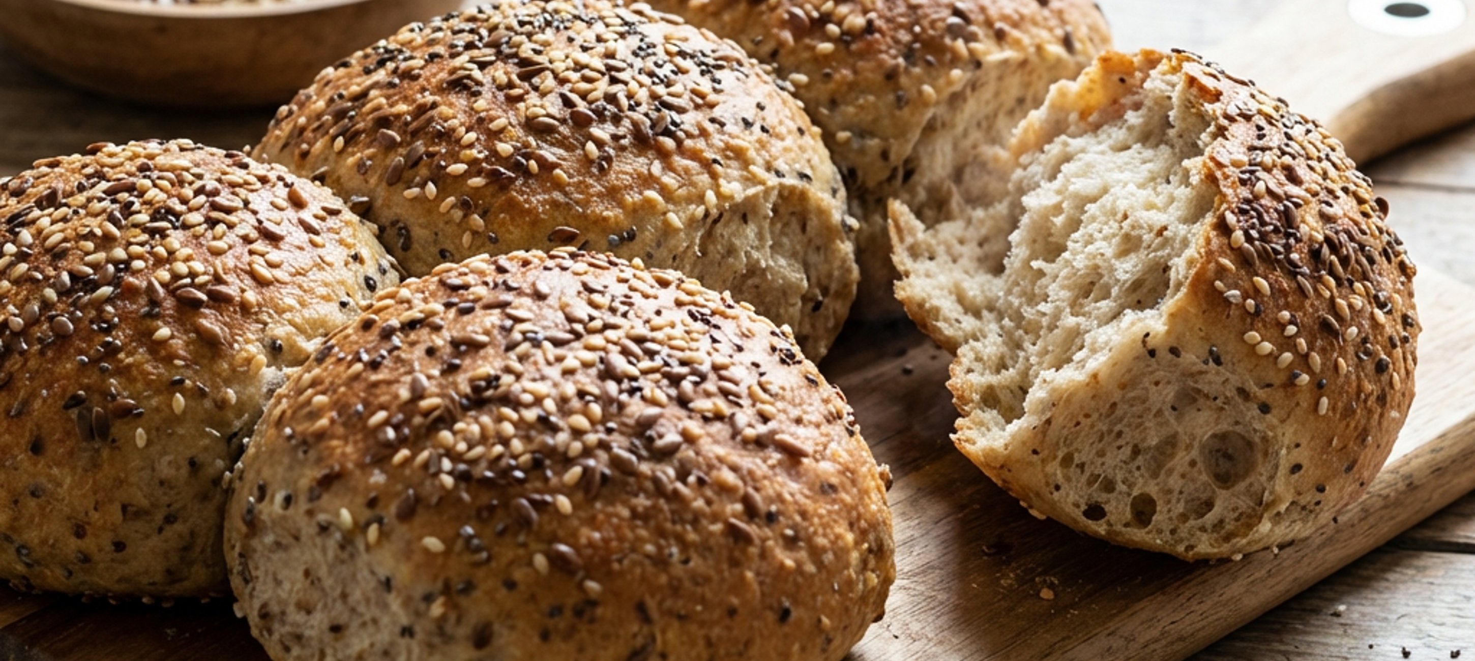 - 2With wet hands, I formed small buns from it, sprinkled seeds on top, then baked them in a baking tray lined with parchment paper at 180 degrees Celsius.