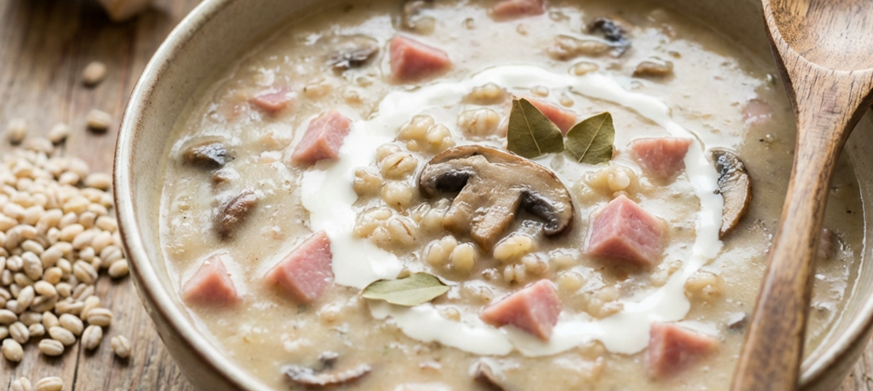 - 6Once the pearl barley is soft, add the thickening mixture, then the diced ham, and season with herbs and vinegar. Salt and pepper to taste if needed.