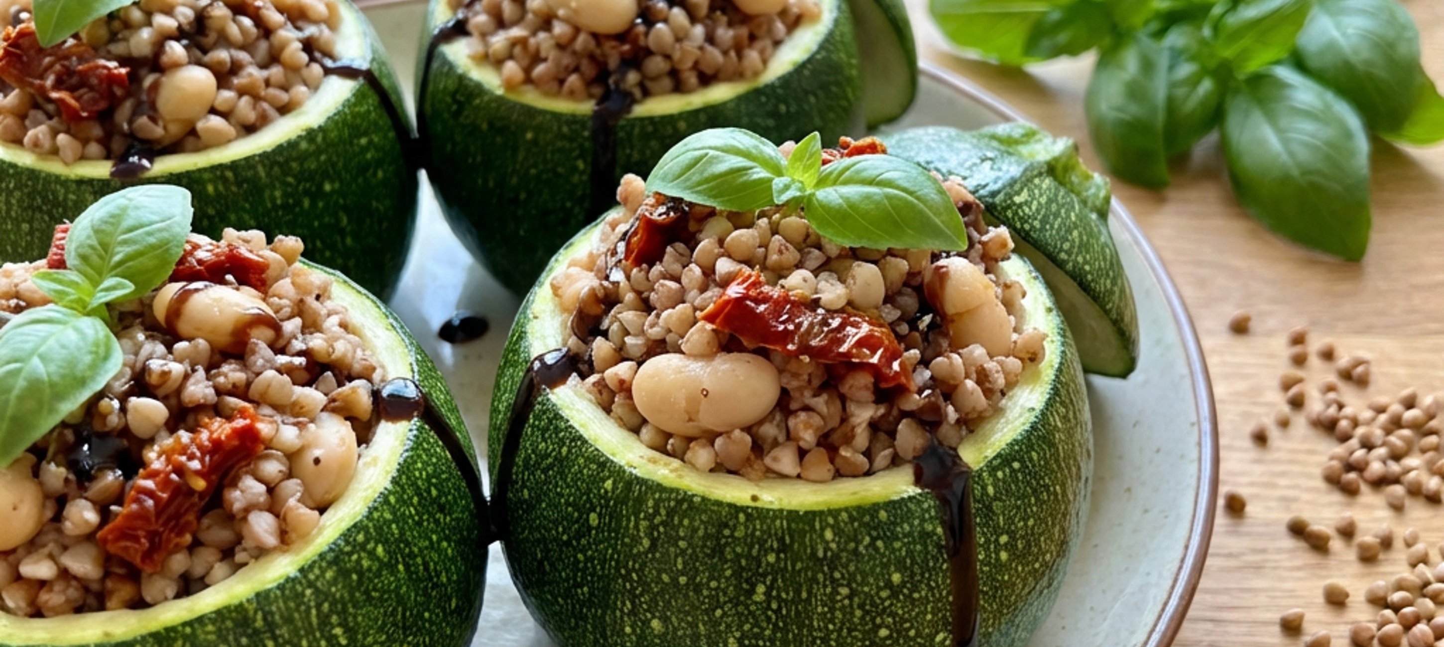 - 5Fill the zucchinis with this buckwheat and bean filling and bake in a preheated oven at 190 degrees Celsius for about 40 minutes until done.